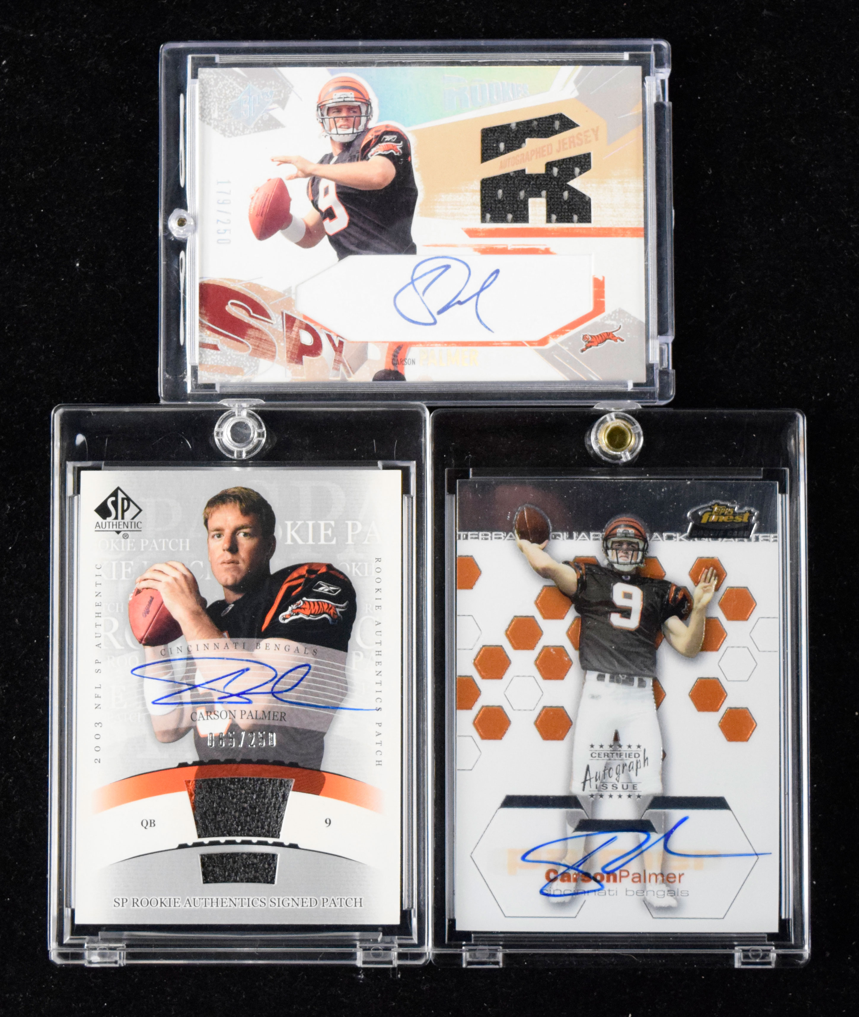 Description:Lot of (3) Carson Palmer signed serial numbered rookie cards (NM-NM/MT). Includes 2003 Topps Finest #119 signed by Palmer (#ed 251/399), 2003 SP Authentic #270 patch card signed by Palmer (#ed 65/250), and 2003 Upper Deck SPx #210 jersey card signed by Palmer (#ed 179/250). Signatures rate 9 to 10 out of 10: NM-NM/MT