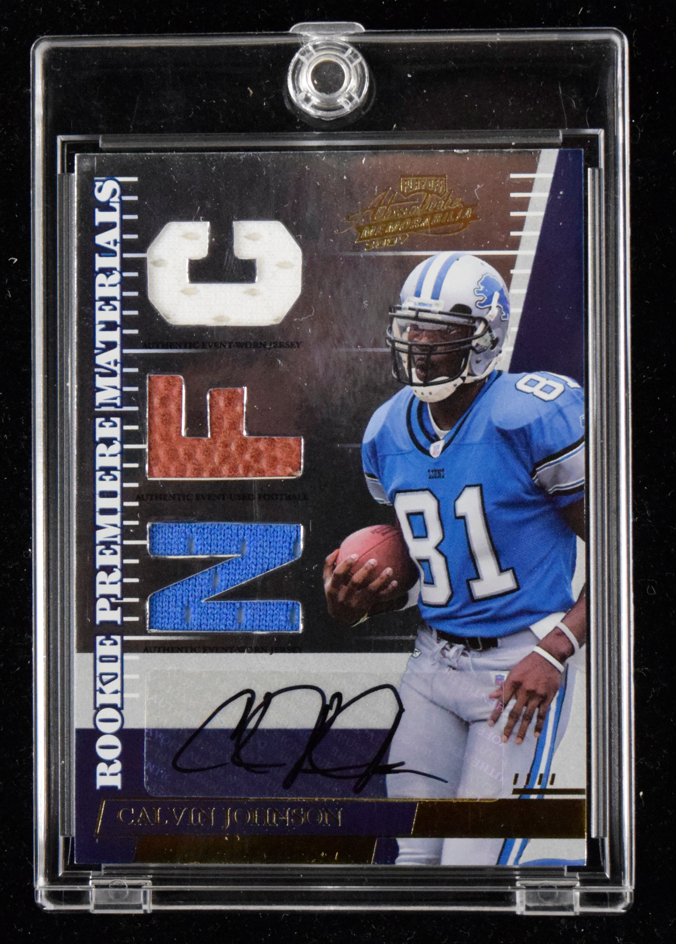 Description:Calvin Johnson signed 2007 Playoff Absolute Memorabilia serial #ed triple relics rookie insert card (NM). 2007 Playoff Absolute Memorabilia "Rookie Premiere Materials Autographs AFC/NFC" #252 containing a football and two jersey swatches. Johnson signed the card in black fine tip marker. Signature rates 9/10 out of 10. The card is #ed 8/25: NM