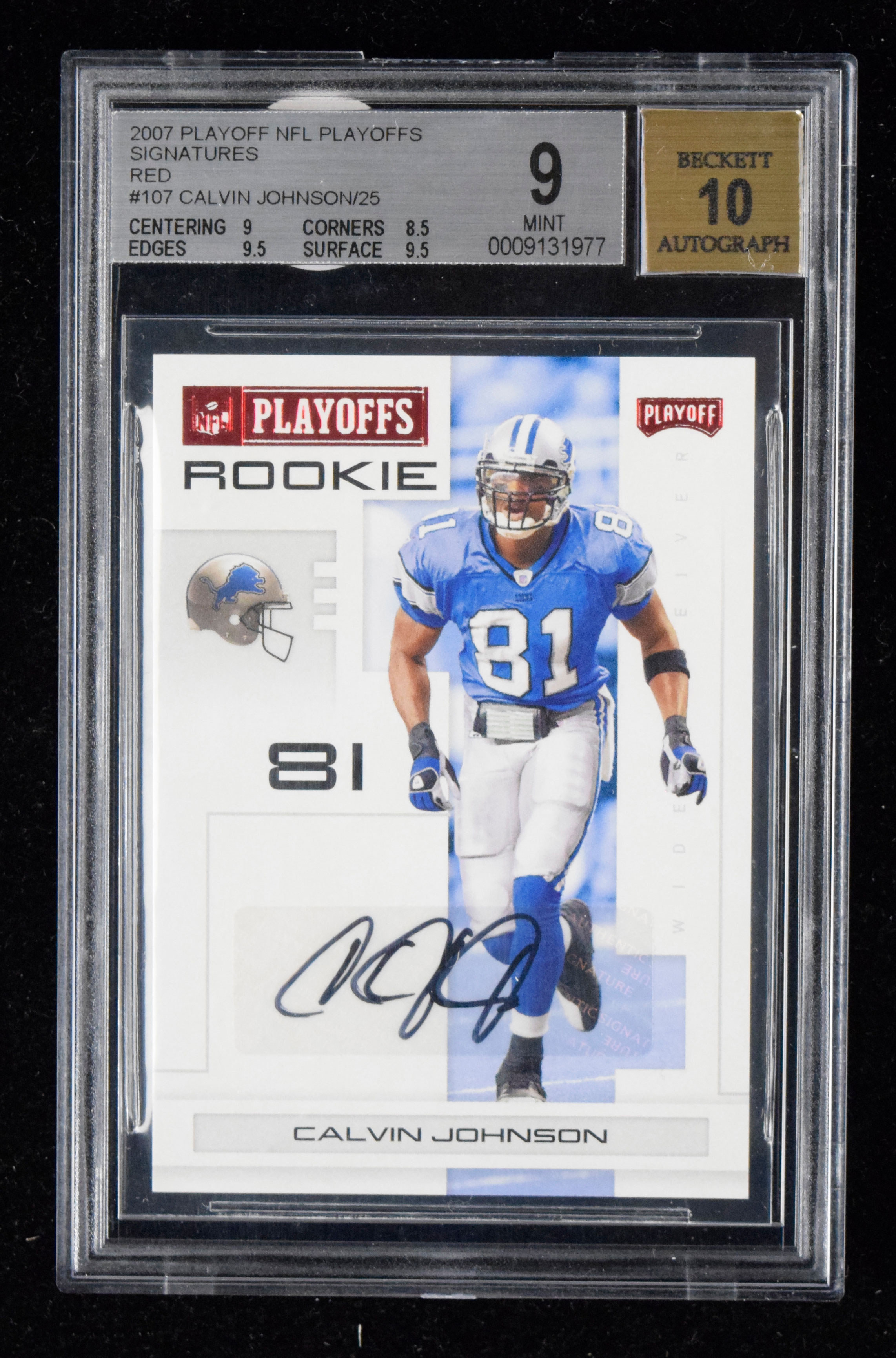2007 Playoff NFL Playoffs "Signatures Red" #107 Calvin Johnson signed rookie insert card #ed 19/25 (Beckett 9 MT, auto graded 10).