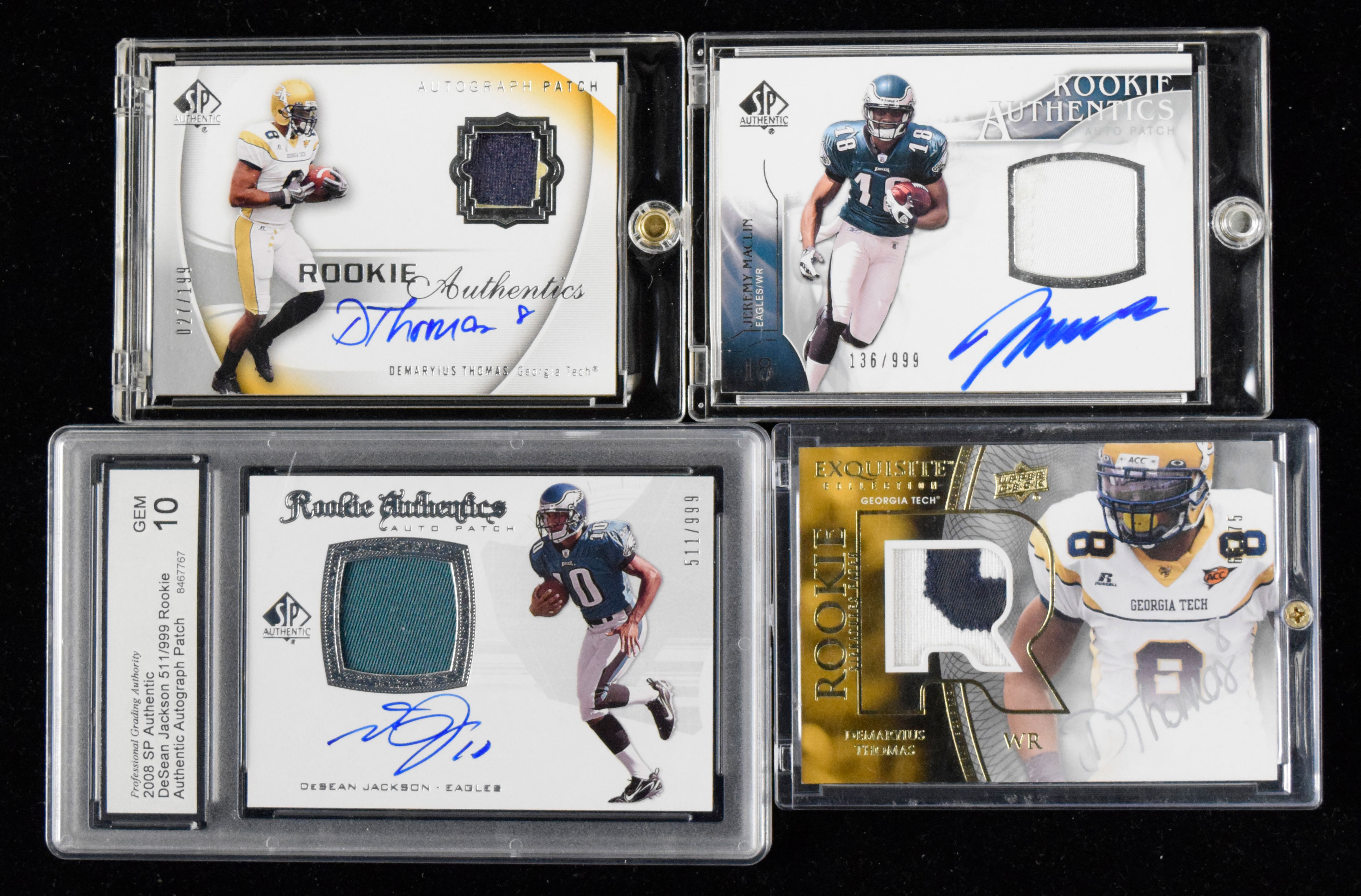 Description:DeSean Jackson, Jeremy Maclin, and (2) Demaryius Thomas signed serial #ed rookie patch autographs (NM-NM/MT). Includes 2008 SP Authentic #290 patch card signed by DeSean Jackson (#ed 511/999), 2009 SP Authentic #385 patch card signed by Jeremy Maclin (#ed 136/999), 2010 SP Authentic #109 patch card signed by Demaryius Thomas (#ed 27/199), and 2010 Upper Deck Exquisite #104 patch card signed by Demaryius Thomas (#ed 66/75). Signatures rate 8 to 10 out of 10: NM-NM/MT