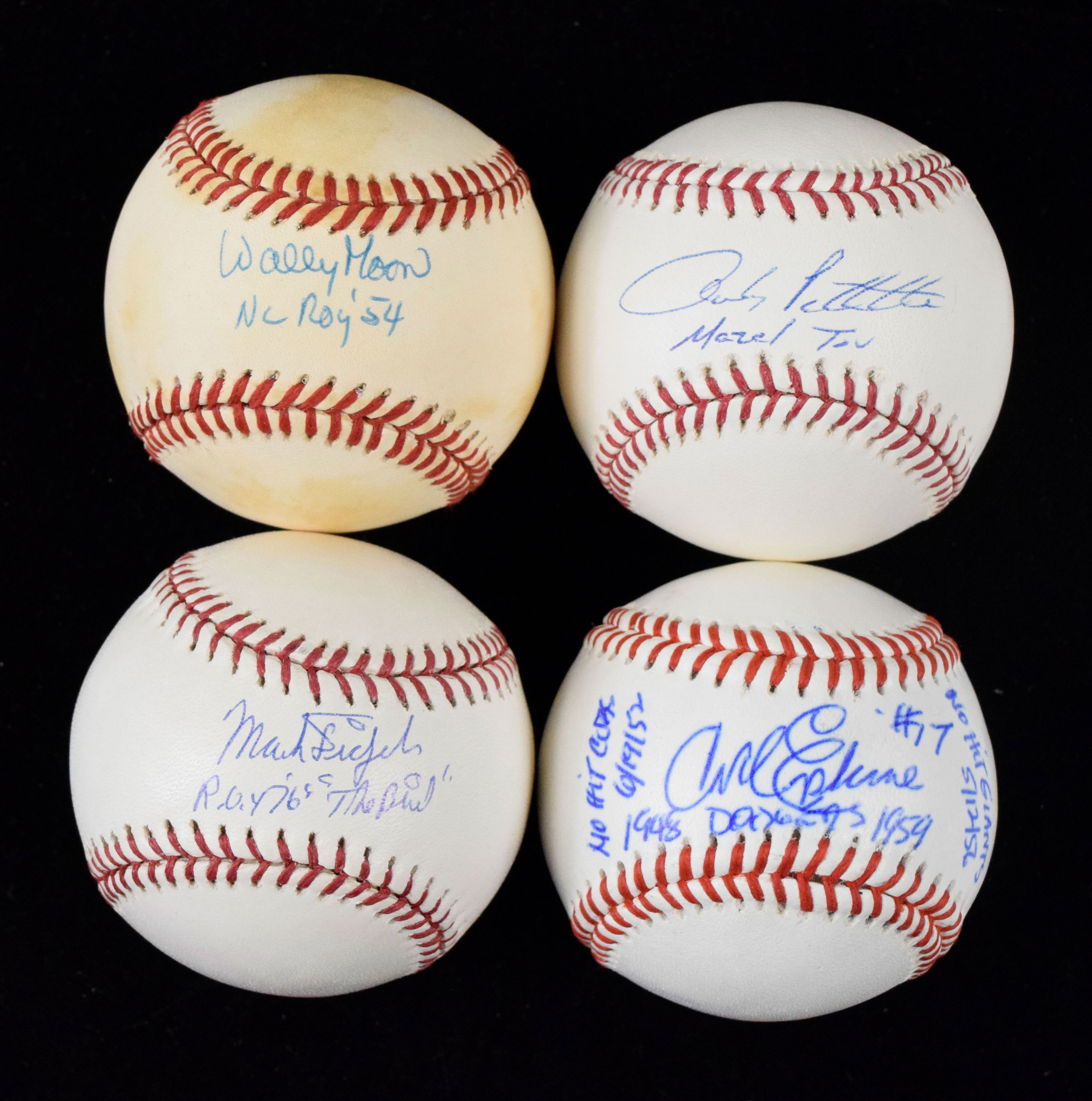 Description:Lot of (8) signed and inscribed baseballs (VG-NM/MT). Includes B.Selig ML ball signed by Mark Fidrych with "ROY 76" "The Bird" inscriptions, L.Coleman NL ball (toned) signed by Wally Moon with "NL ROY '54" inscription, Rawlings Official League ball signed by Carl Erskine with "1948 Dodgers 1959" "No Hit Cubs 6/19/52" "No Hit Giants 5/12/56" inscriptions, B.Selig ML ball signed by Andy Pettitte with "Mazel Tov" inscription (MLB Authenticated), B.Selig ML ball (light toning) signed by Dwight Gooden with "5-14-96 No Hitter" inscription (Steiner), L.Coleman NL ball (toning) signed by Dave Kingman with "'79 '82 HR Champ" inscription, B.Selig ML ball (light toning) signed by Orlando Hernandez with "Duke" inscription, and B.Selig ML ball (light toning) dual-signed by Armando Galarraga with "Almost Perfect" inscription and Jim Joyce with "6/2/10" inscription (Mounted Memories). Signatures rate 7/8 to 9/10 out of 10: VG-NM/MT