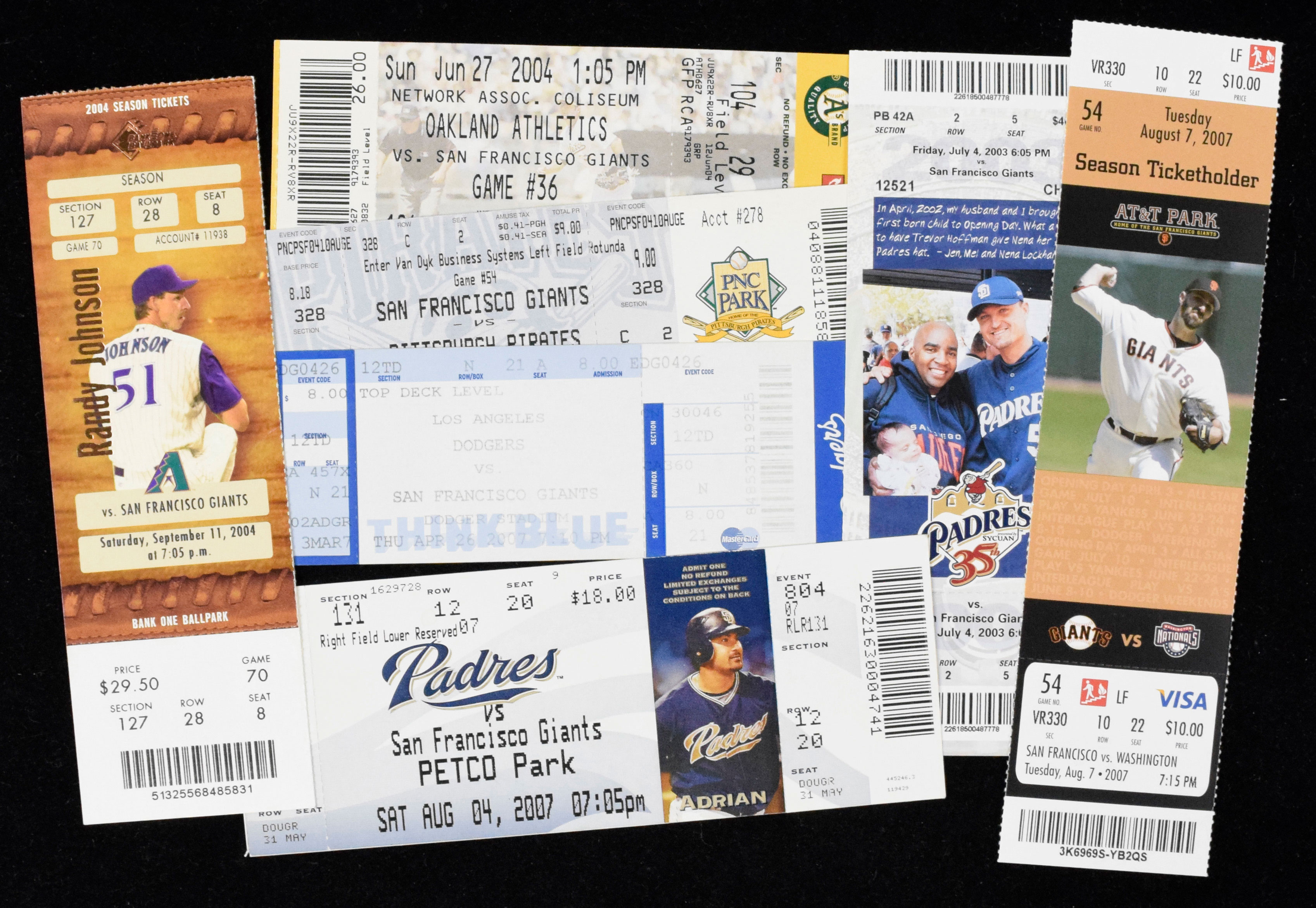 Description:Lot of (7) Barry Bonds historic event full tickets (NM-NM/MT). Includes 7/4/2003 San Francisco Giants at San Diego Padres (HR #638 and walk #2000), 6/27/2004 Giants at Oakland Athletics (HR #677 and run scored #2000), 8/10/2004 Giants at Pittsburgh Pirates (HR #688 and record 13th straight 30-HR season), 9/11/2004 Giants at Arizona Diamondbacks (Bonds walks 3 times to break his own record and become the first to walk over 200 times in a season), 4/26/2007 Giants at Los Angeles Dodgers (run scored #2166 to break Pete Rose's NL record), 8/4/2007 Giants at Padres (HR #755 to tie Hank Aaron), and 8/7/2007 Washington Nationals at Giants (HR #756 to break all-time record): NM-NM/MT