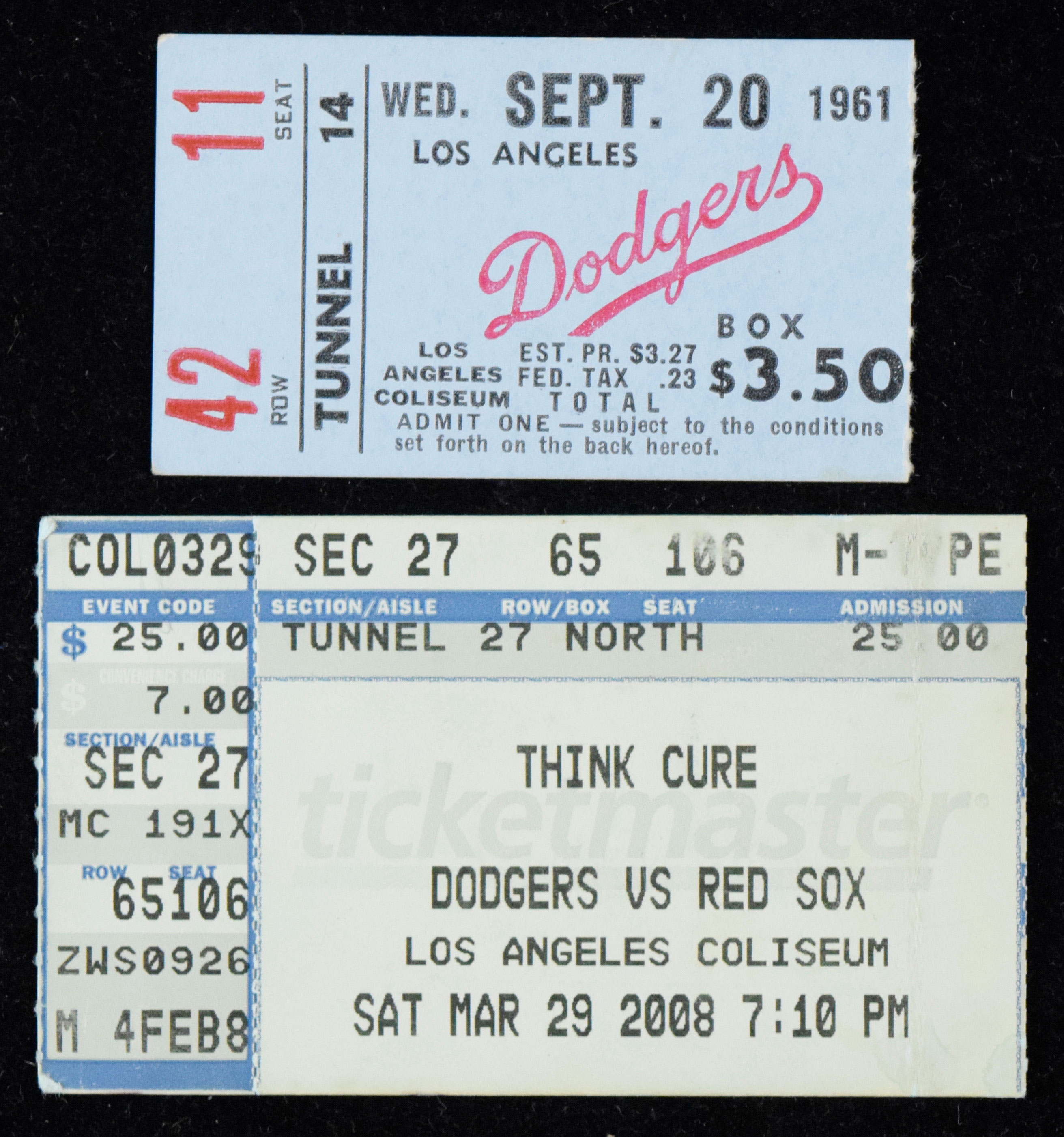 Description:Los Angeles Dodgers 1961 LA Coliseum final game ticket stub plus 2008 exhibition game ticket (VG-EX). Includes 9/20/1961 Chicago Cubs at Dodgers ticket stub from the last regular season game played at the LA Memorial Coliseum (VG/EX-EX, Sandy Koufax 13-inning CG win with 15-Ks); and 3/29/2008 Boston Red Sox vs Dodgers ticket stub from exhibition game played at the LA Coliseum (VG creased).