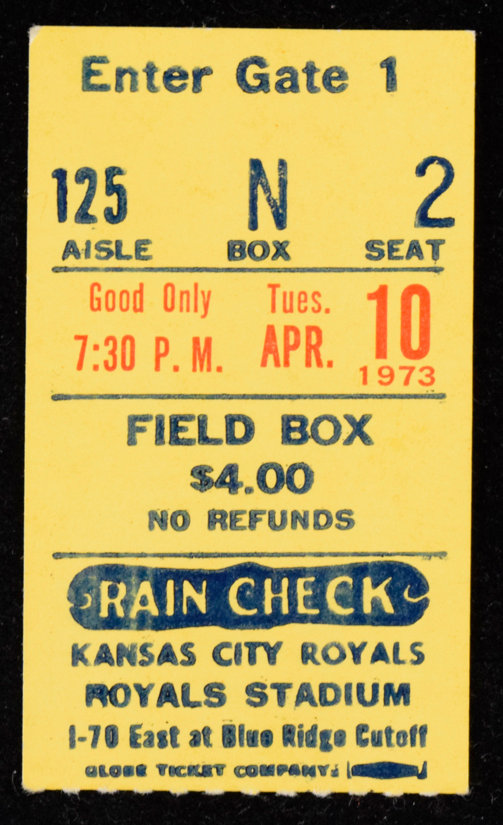 Description:1973 Royals Stadium (now Kauffman Stadium) opening game ticket stub (EX). April 10th ticket stub from the inaugural game at Kauffman Stadium in which the Kansas City Royals defeated the Texas Rangers by a score of 12-1. Light corner wear, and a very minor edge crease: EX