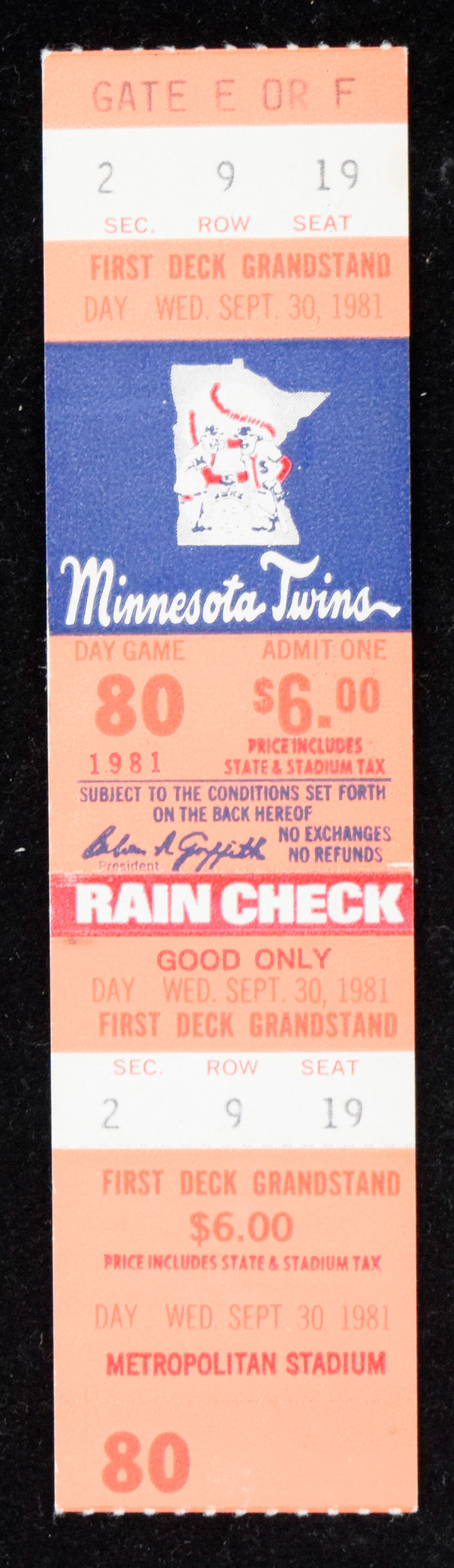 Description:1981 Metropolitan Stadium final game full ticket (EX/MT-NM). September 30th full ticket for the final game played at Metropolitan Stadium in which the Kansas City Royals defeated the Minnesota Twins by a score of 5-2. Strong condition with just a hint of light wear: EX/MT-NM