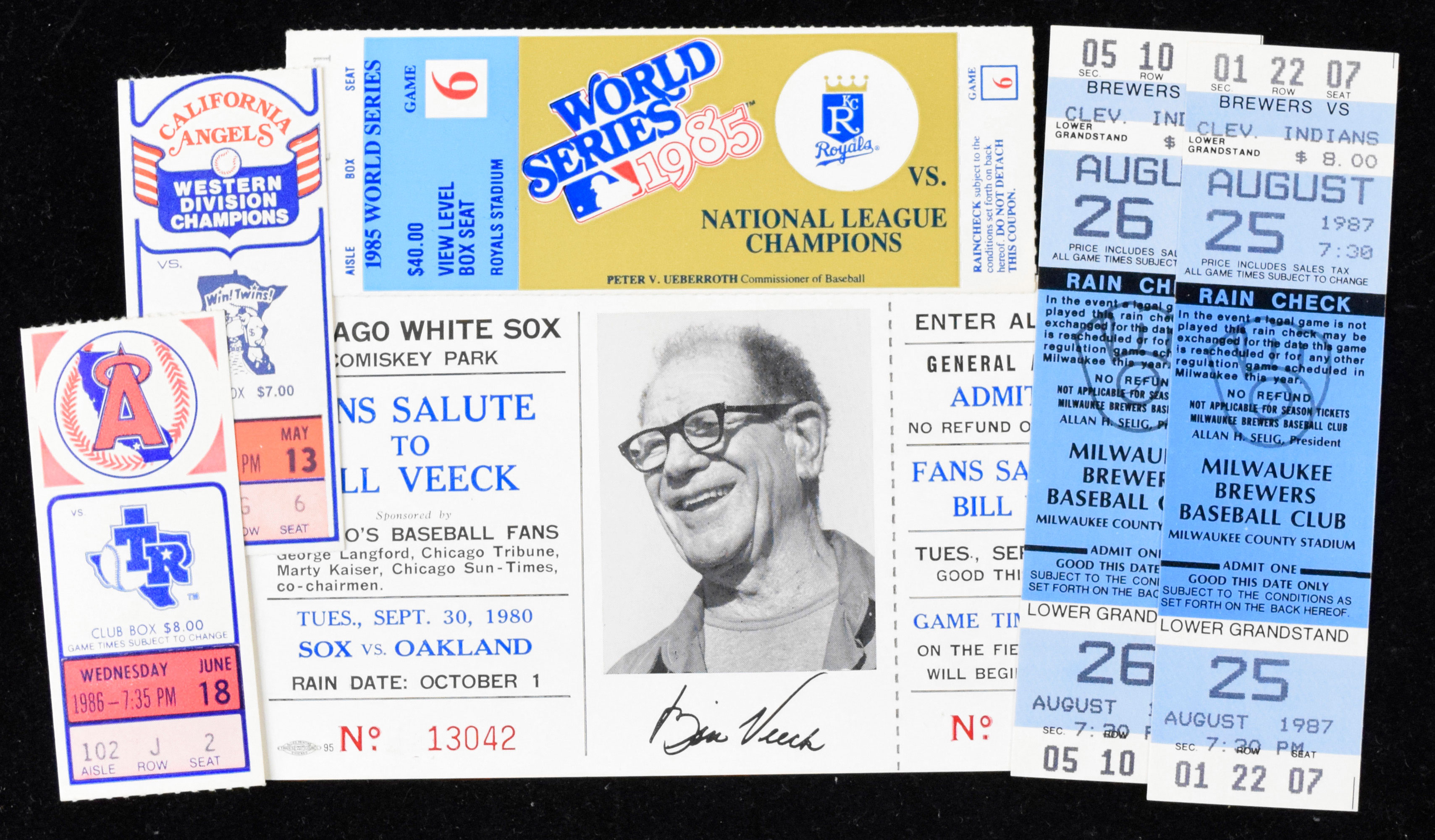 Description:Lot of (6) MLB full tickets and ticket stubs from 1980-1987 (EX/MT-NM/MT). Includes 9/30/1980 Oakland Athletics at Chicago White Sox full ticket for Bill Veeck Night (EX/MT-NM, Rickey Henderson breaks Ty Cobb's AL record for stolen bases in a season); 5/13/1983 Minnesota Twins at California Angels ticket stub (EX/MT-NM, Reggie Jackson became the first player in MLB history to strikeout 2,000 times); 1985 World Series Game 6 ticket stub (EX/MT, Don Denkinger blown call at 1st base); 6/18/1986 Texas Rangers at Angels ticket stub (EX/MT-NM, Don Sutton 300th win); 8/25/1987 Cleveland Indians at Milwaukee Brewers full ticket (NM, Paul Molitor's hitting streak reaches 39 games); and 8/26/1987 Indians at Brewers full ticket (NM-NM/MT, Molitor's hitting streak ends).