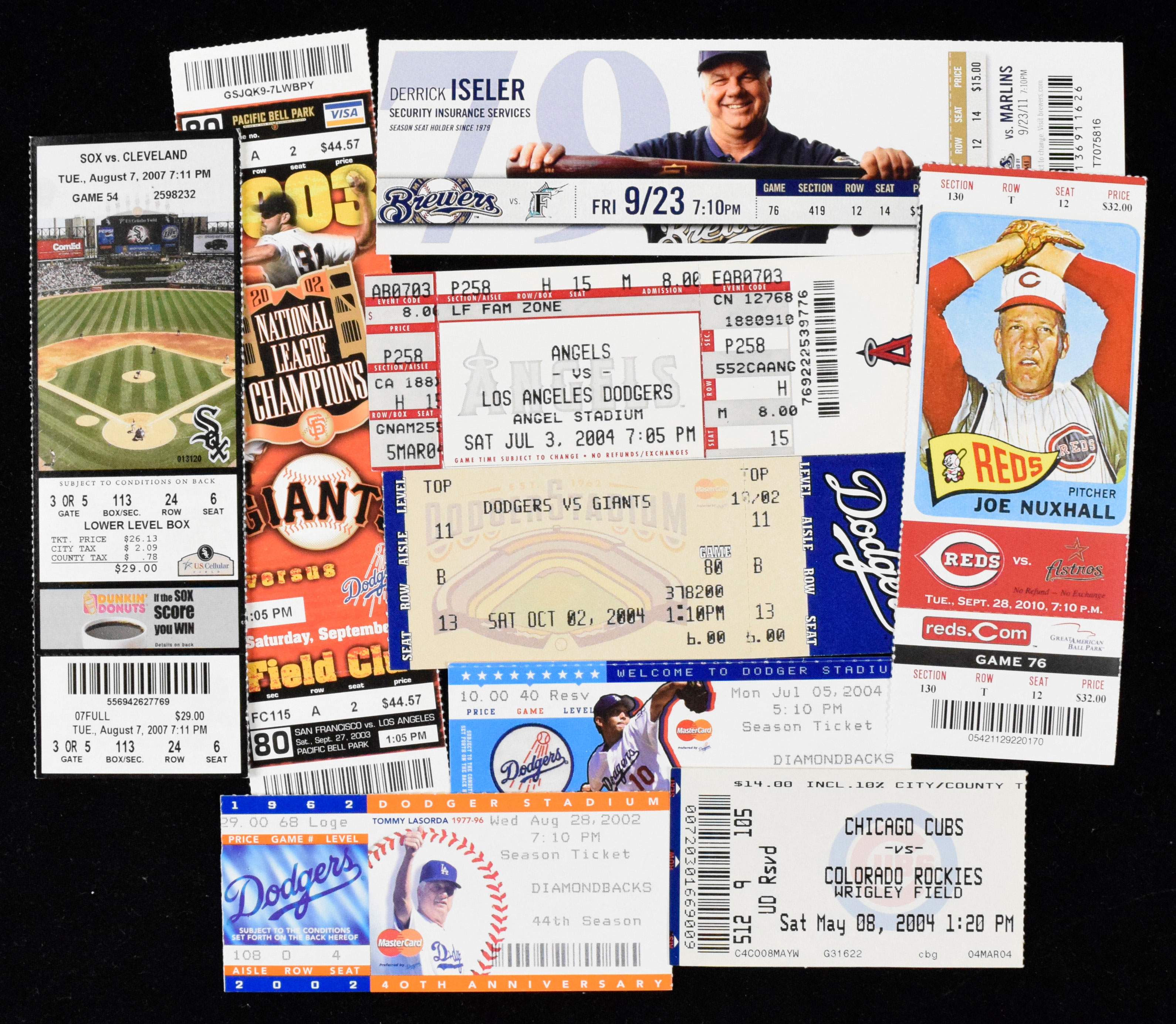 Description:Lot of (9) MLB full tickets and ticket stubs from 2002-2010 (GD-NM/MT). Includes 8/28/2002 Arizona Diamondbacks at Los Angeles Dodgers ticket stub (Eric Gagne's 1st of record consecutive saves streak), 9/27/2003 Dodgers at San Francisco Giants full ticket (Andres Galarraga's 2000th career strikeout), 5/8/2004 Colorado Rockies at Chicago Cubs ticket stub (Sammy Sosa 547th HR and 2000th strikeout), 7/3/2004 Dodgers at Anaheim Angels full ticket (last of Eric Gagne's record 84 consecutive saves), 7/5/2004 Diamondbacks at Dodgers ticket stub (Gagne blows save to end streak), 10/2/2004 Giants at Dodgers full ticket (Steve Finley walk-off grand slam clinches NL West), 8/7/2007 Cleveland Indians at Chicago White Sox full ticket (GD, Jim Thome 2000th strikeout), 9/28/2010 Houston Astros at Cincinnati Reds full ticket (Jay Bruce walk-off HR clinches NL Central), and 9/23/2011 Florida Marlins at Milwaukee Brewers full ticket (Ryan Braun game winning HR to clinch 1st division title in 29 years). Most appear to average NM overall. Range: GD-NM/MT