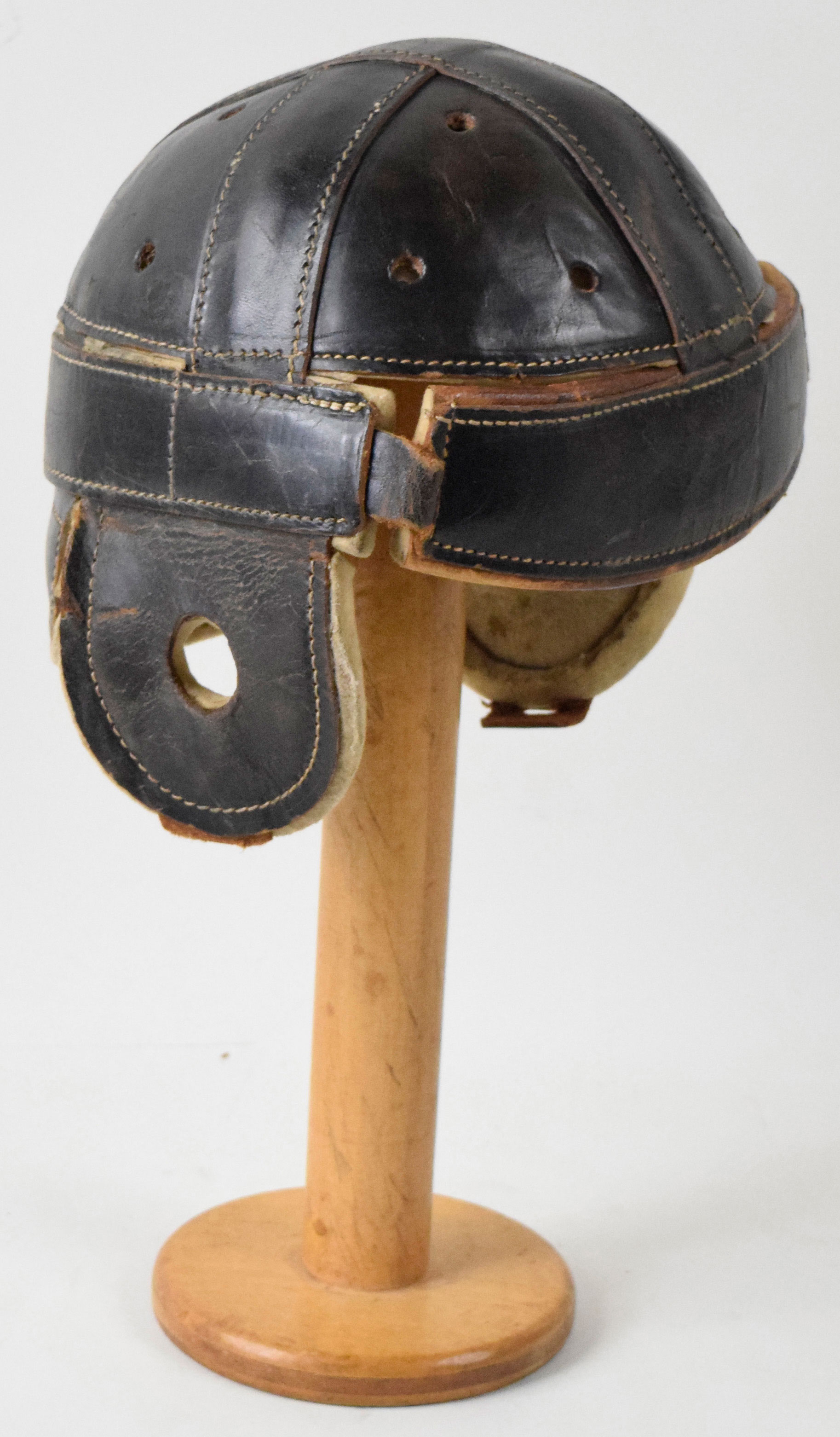 Description:Wright & Ditson football helmet, c.1920s (VG). Leather molded crown head harness helmet with Wright & Ditson logo and 3HG model number stamped on the front. Used, with chin strap missing: VG