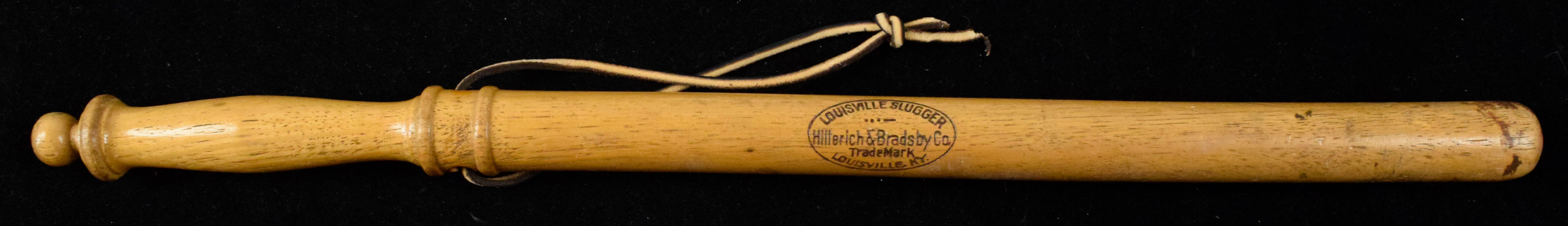Description:Louisville Slugger billy club, c.1930s-40s (EX). 23" Louisville Slugger nightstick with logo at the centerbrand area. Scattered surface wear and some staining at the end: EX