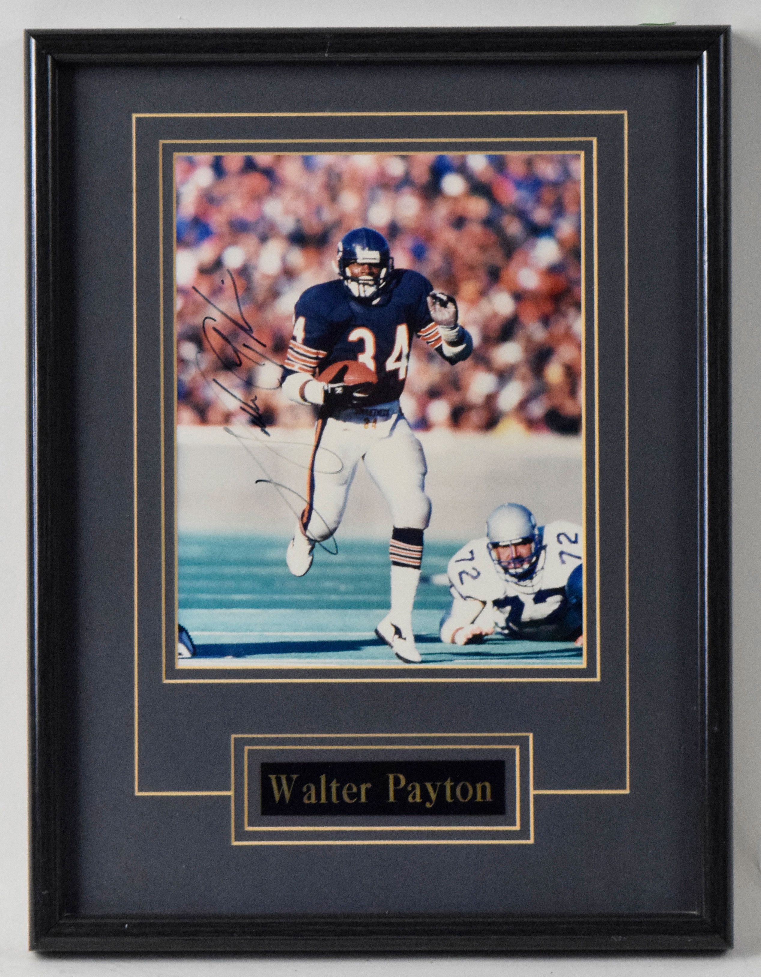 Description:Walter Payton signed photograph (NM framed). Frame measures approx. 13"x17". Payton signed the photo in black marker. Signature rates 7 out of 10. Due to framing, complete condition is unknown: NM appearance