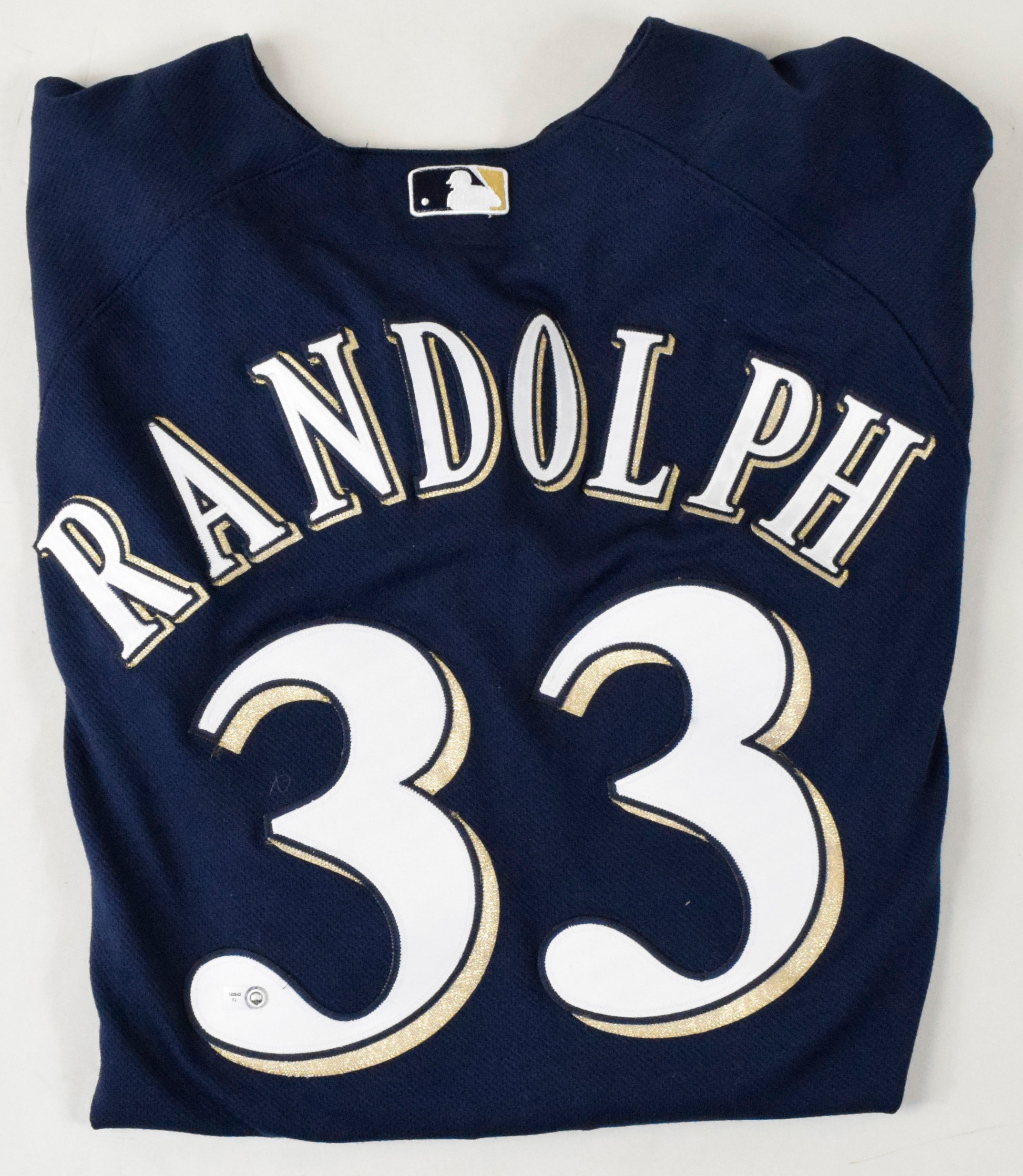 Description:2010 Willie Randolph game worn Milwaukee Brewers jersey (EX/MT). Majestic MLB Authentic Collection size 46 Brewers #33 Willie Randolph jersey with Brewers 40th Anniversary patch sewn on the right sleeve, and "'10 Randolph 46 2418" strip tag sewn inside the collar. MLB Authenticated serial #FJ143943 hologram sticker is on the jersey. Database dates the jersey to their September 23rd game against the Marlins, but heavy curling to the wash tag indicates the jersey was likely also worn in previous games: EX/MT