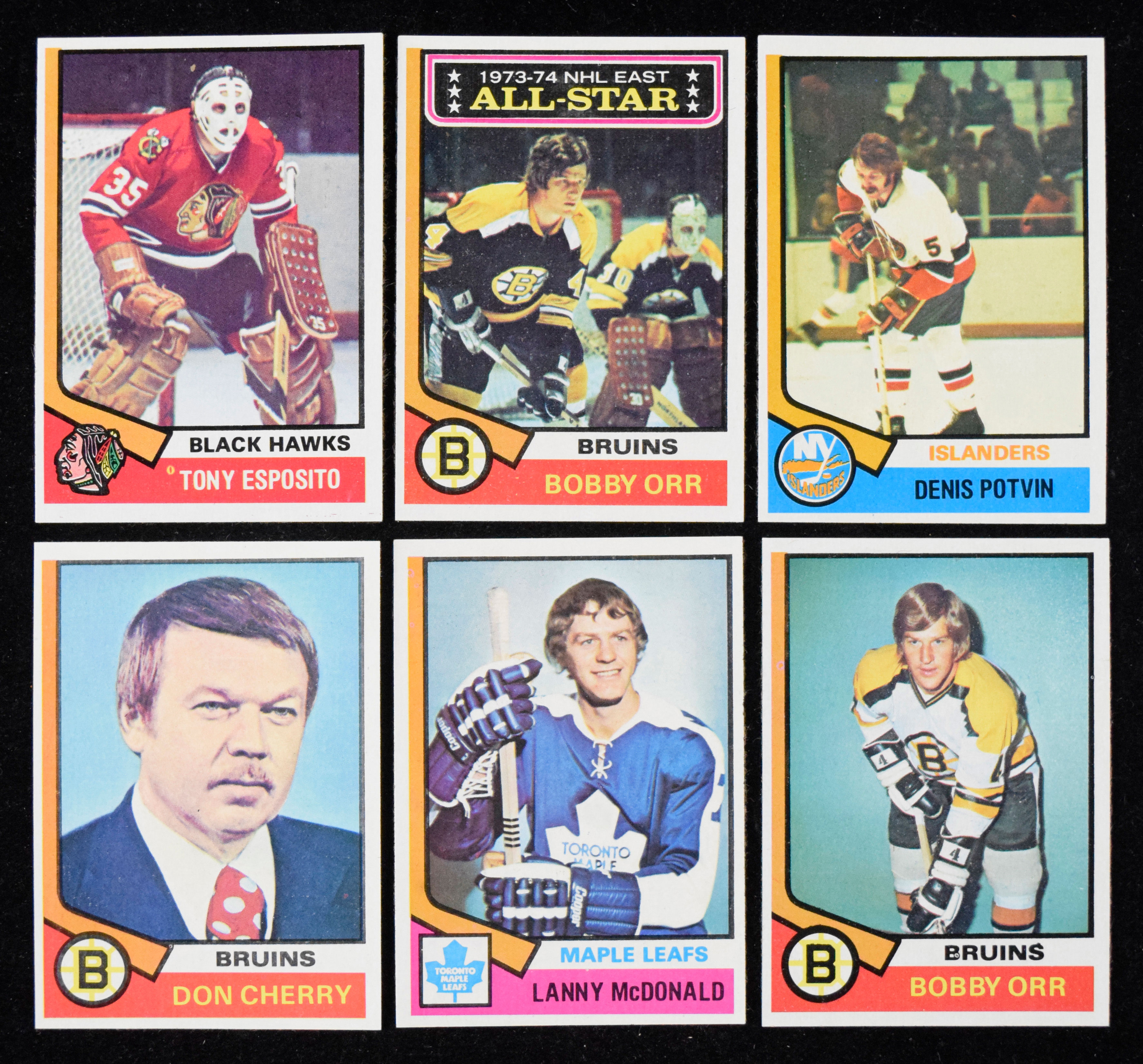 1974-75 Topps Hockey card set (EX-NM/MT). Key cards grade: #s 100 Bobby Orr (NM), 130 Orr (NM), 161 Don Cherry rookie (NM slightly OC), 186 Lanny McDonald rookie (NM), 195 Denis Potvin rookie (NM oc). Remainder appear to average NM overall. Range: EX-NM/MT