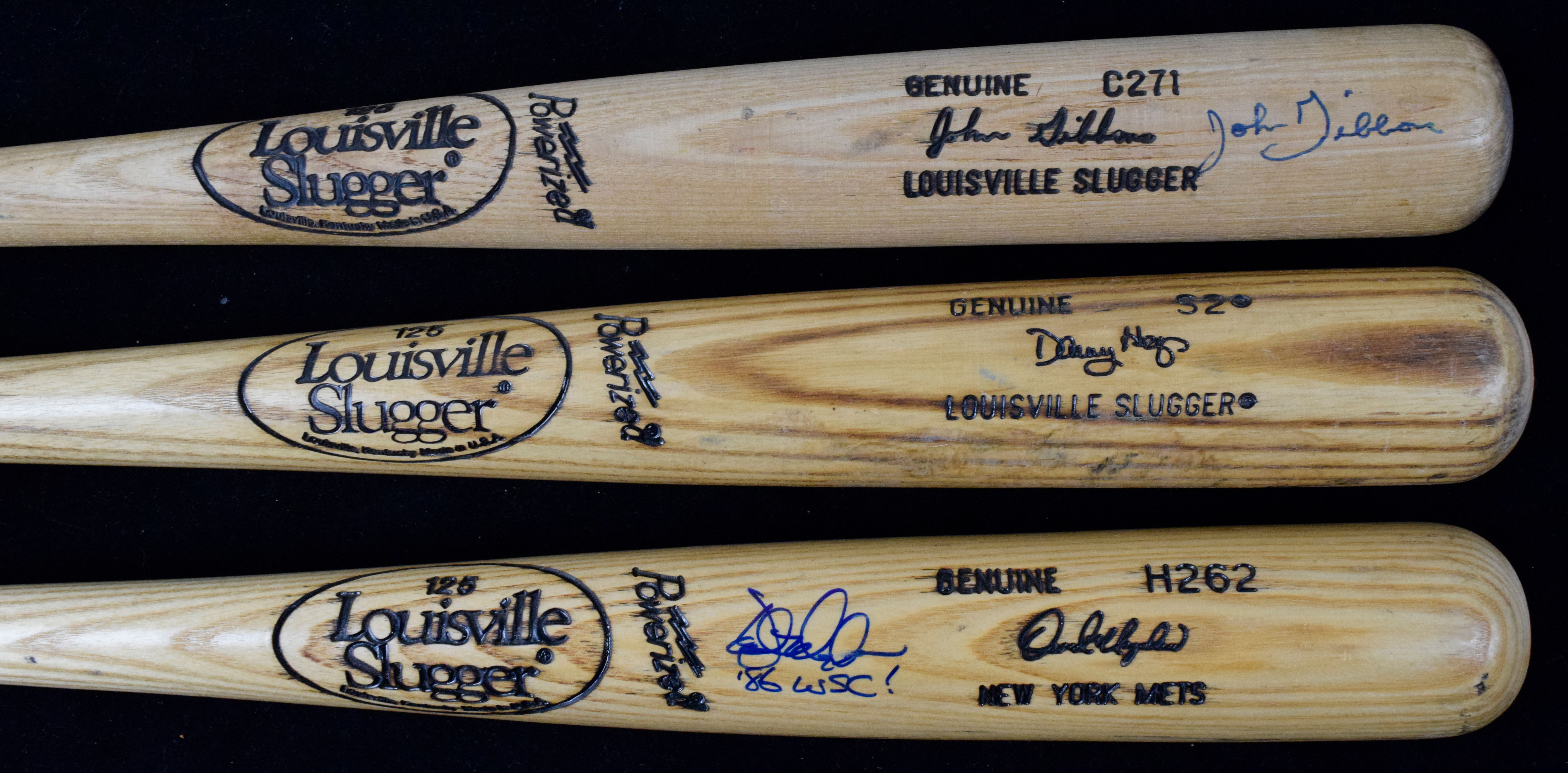 Description:Lot of (5) 1986 New York Mets professional model baseball bats (VG-EX/MT). Includes c.1986 34" Louisville Slugger C271 John Gibbons model bat signed by Gibbons in blue marker (EX-EX/MT); c.1986-89 34" Louisville Slugger S2 Danny Heep model bat (EX); c.1986-89 34" Louisville Slugger M110 Rafael Santana model bat signed by Santana in blue marker (VG crack); c.1987-89 34" Louisville Slugger C271 Kevin Elster model bat signed by Elster in blue marker with "My First Model Bat" "86 W.S.C." inscriptions (VG-VG/EX repaired cracks); and c.1991 34" Louisville Slugger H262 Dave Magadan model bat signed by Magadan in blue marker with "86 WSC!" inscription (EX-EX/MT). Signatures rate 6/7 (Santana smudge) to 9 (avg 8) out of 10: VG-EX/MT