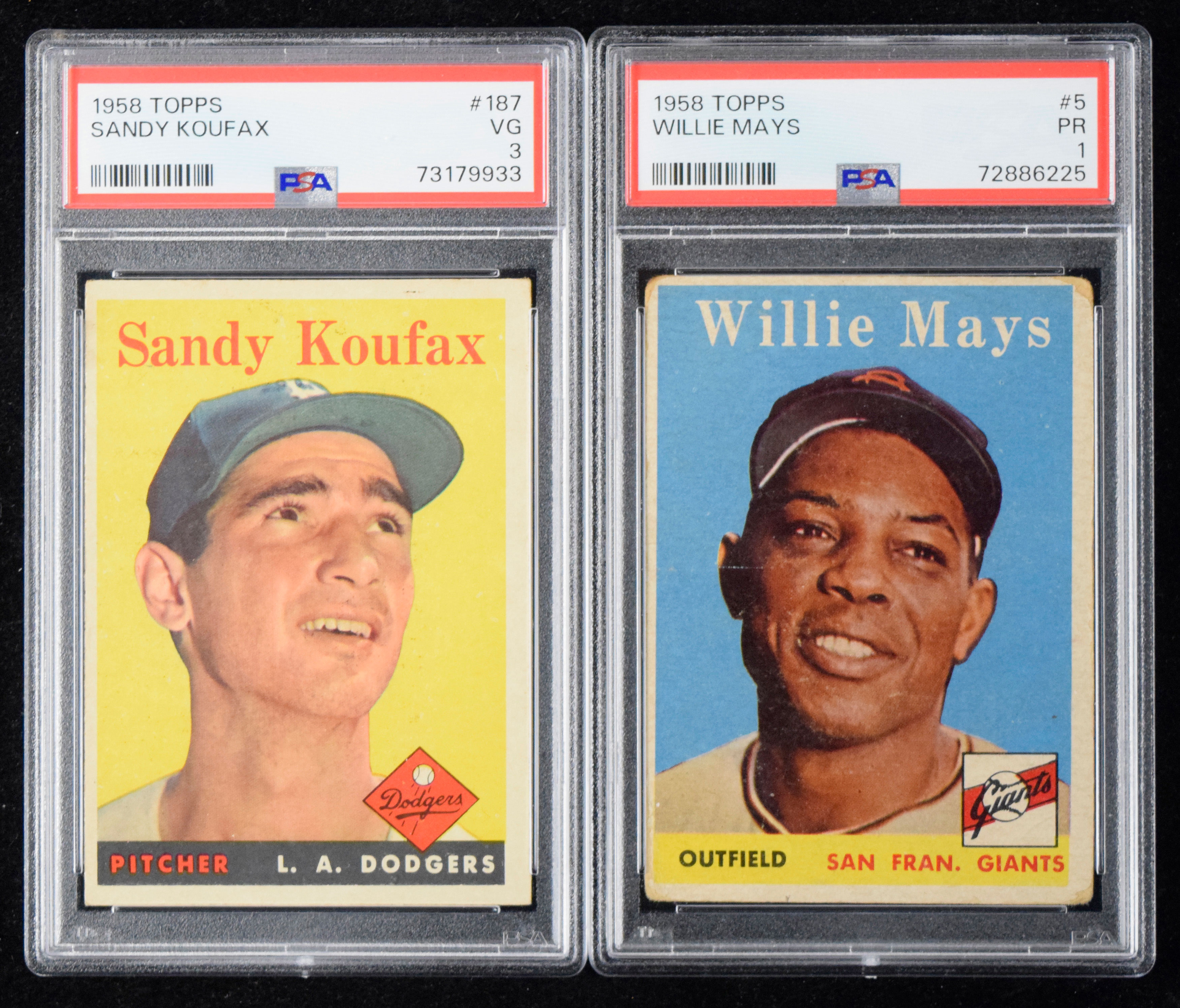1958 Topps #s 5 Willie Mays (PSA 1 PR) and 187 Sandy Koufax (PSA 3 VG).