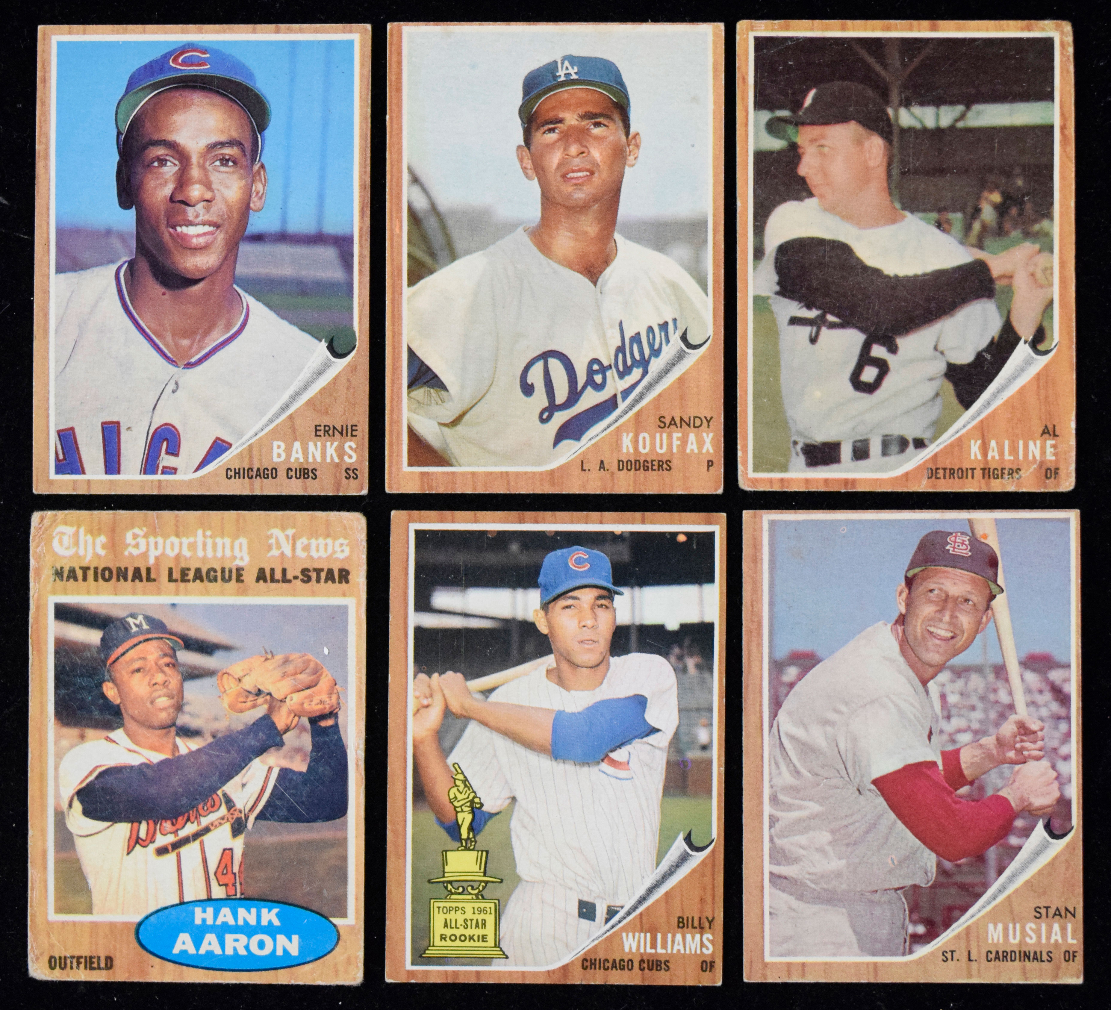 Description:Lot of (99) 1962 Topps Baseball cards including HOFers (PR-EX). Highlights include #s 1 Maris, 5 Sandy Koufax, 25 Ernie Banks, 29 Casey Stengel, 45 Brooks Robinson, 50 Stan Musial, 54 NL HR Leaders, 142 Babe Ruth, 143 Ruth, 144 Ruth, 150 Al Kaline, 288 Billy Williams, 394 Hank Aaron, 468 Robinson, 469 Luis Aparicio. Remainder are mostly commons, with some minor and regional stars mixed in. Various conditions throughout the lot. Most appear to average GD-G/VG overall. Range: PR-EX