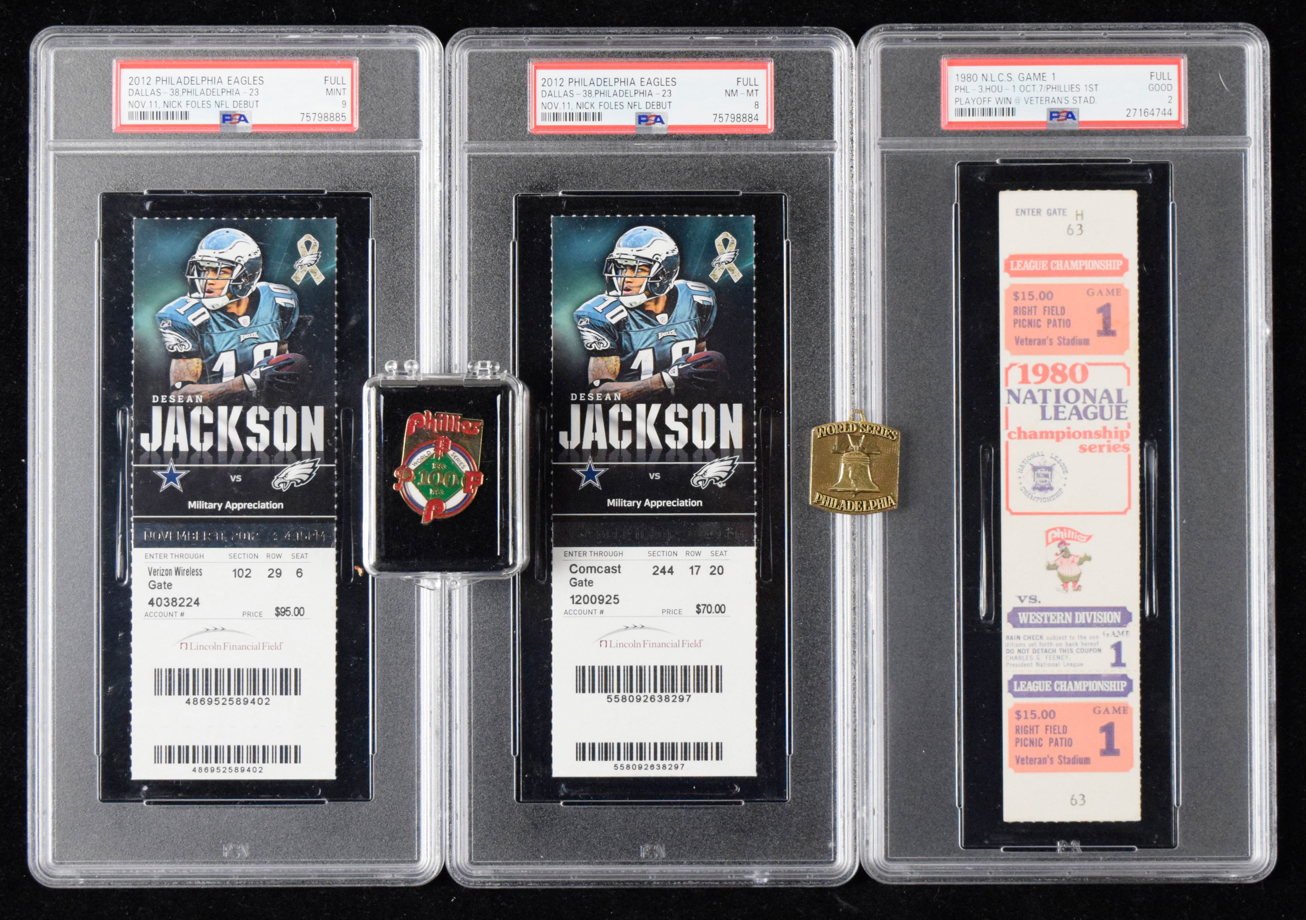 Description:Lot of Philadelphia Phillies and Eagles memorabilia and tickets (GD-MT). Includes 1976 Phillies phantom World Series press charm (NM), 1980 NLCS Game 1 full ticket (PSA 2 GD), Phillies 1983 World Series press pin (NM/MT), and (2) 11/11/2012 Dallas Cowboys at Philadelphia Eagles full tickets from the NFL debut of Nick Foles (PSA 8 NM/MT and 9 MT).