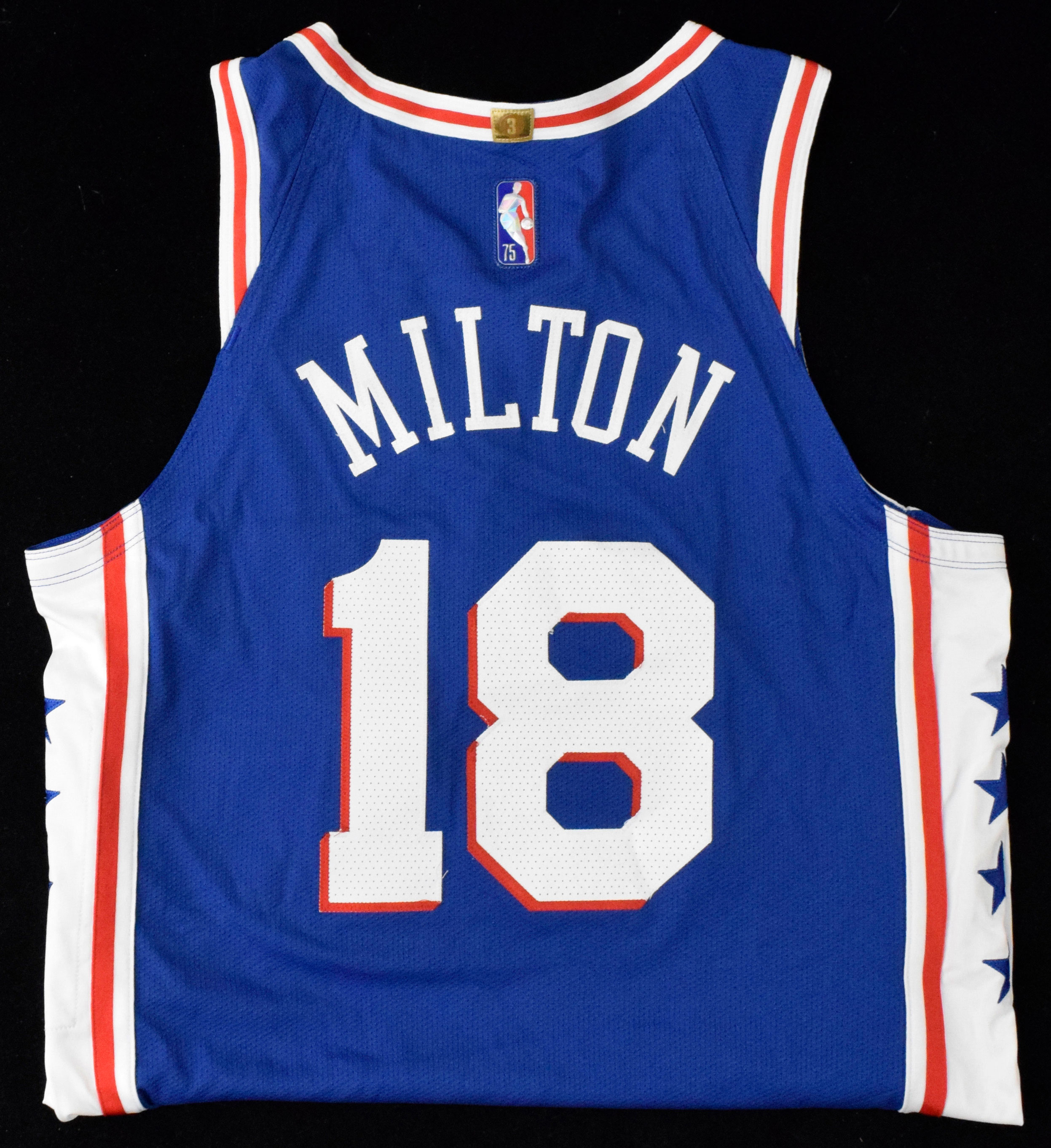 Description:2022 Shake Milton game worn Philadelphia 76ers jersey with team COA and Fanatics authentication (EX/MT). Nike "Icon Edition" size 46 (+4) 76ers #18 Shake Milton jersey worn during their April 3rd game against the Cavaliers. Includes COA from the 76ers, and Fanatics serial #ed hologram sticker on the jersey. Milton scored 4 points in the game: EX/MT