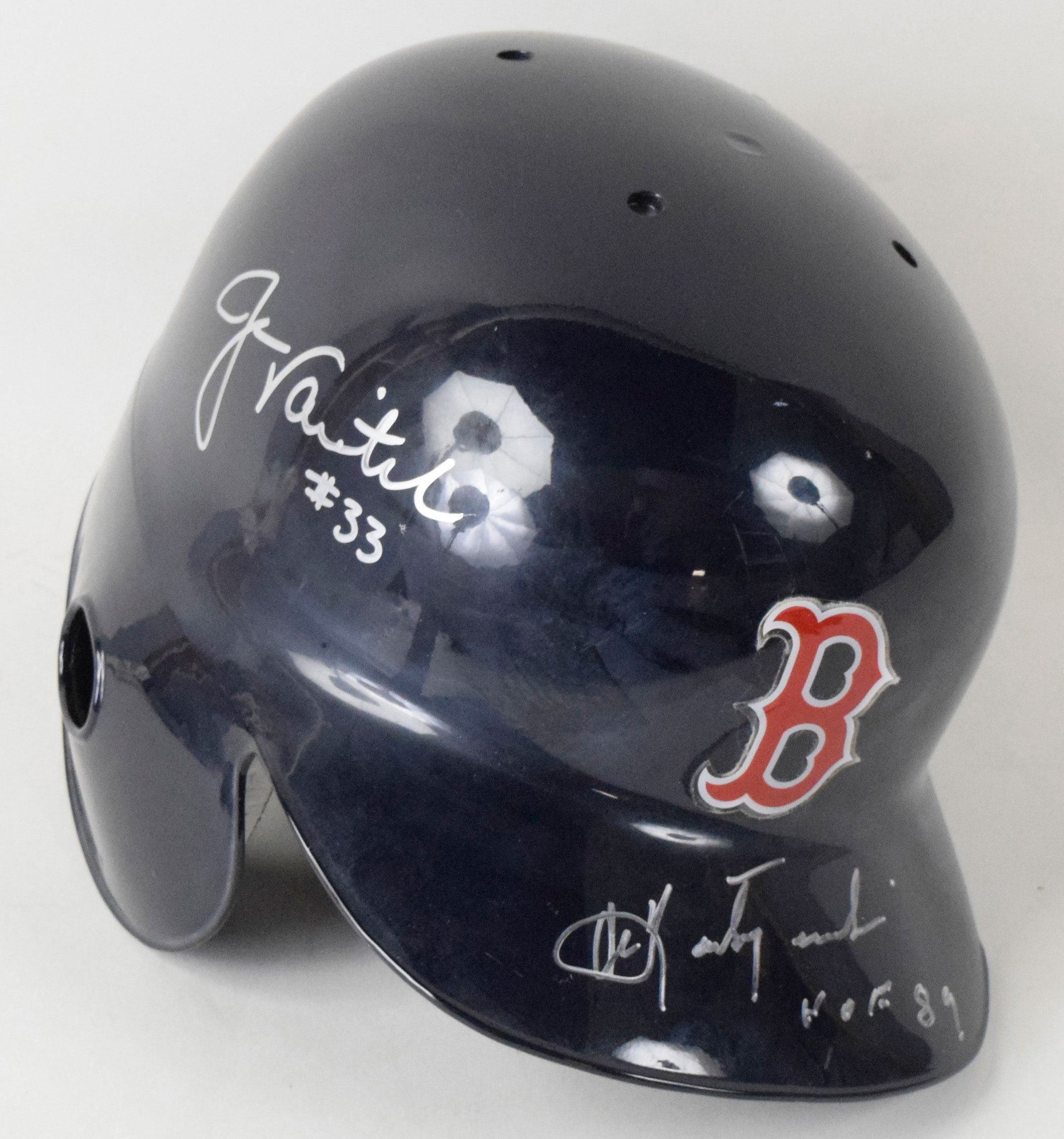 Description:Carl Yastrzemski, Jim Rice, and Jason Varitek multi-signed Boston Red Sox full size helmet (EX). Rawlings size 7-1/2 Red Sox helmet signed by all three in silver marker with Yastrzemski adding "HOF 89" inscription. Signatures rate 8 to 9 out of 10. Scattered scuff marks on the surface: EX