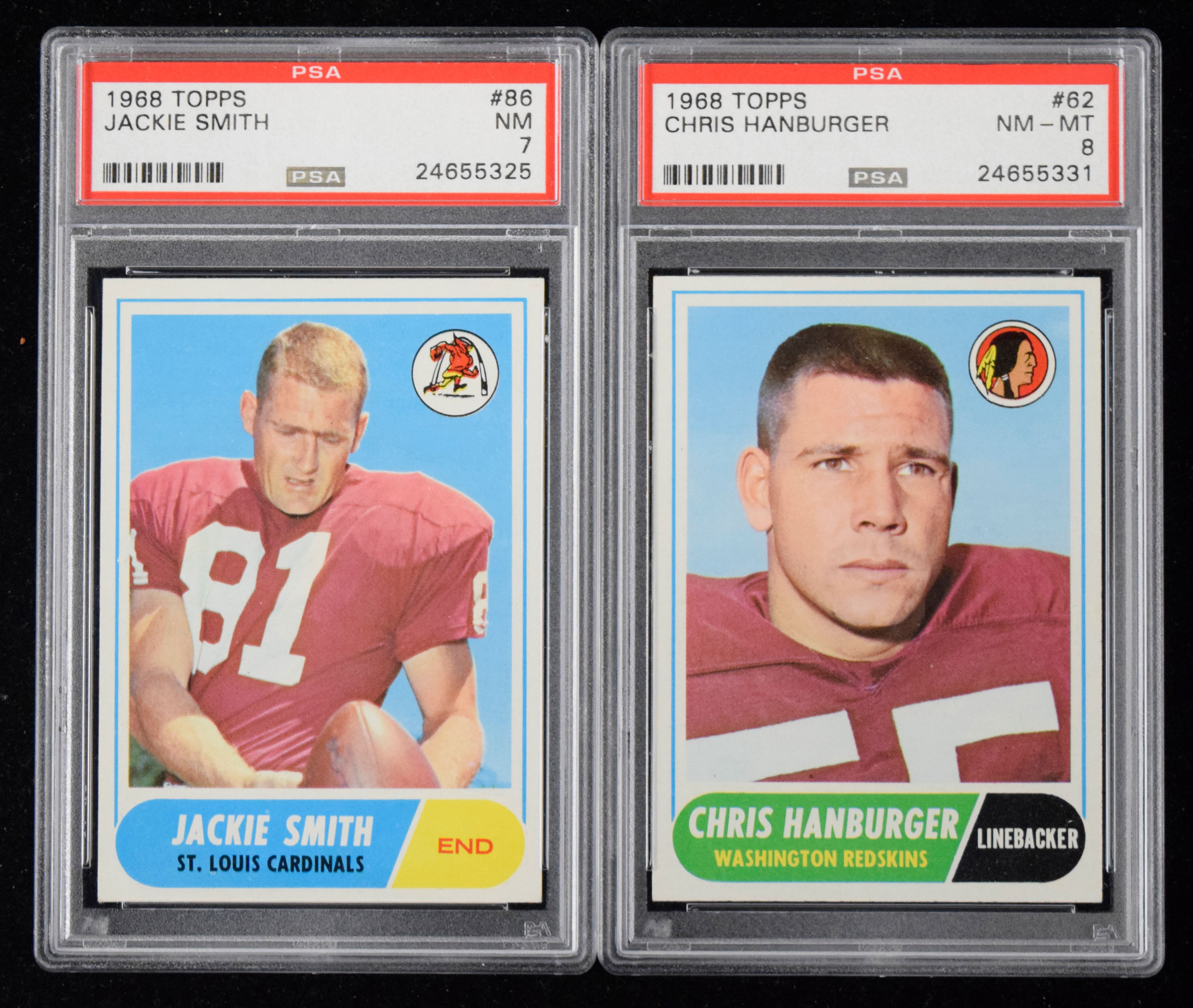 1968 Topps #s 62 Chris Hanburger (PSA 8 NM/MT) and 86 Jackie Smith (PSA 7 NM).