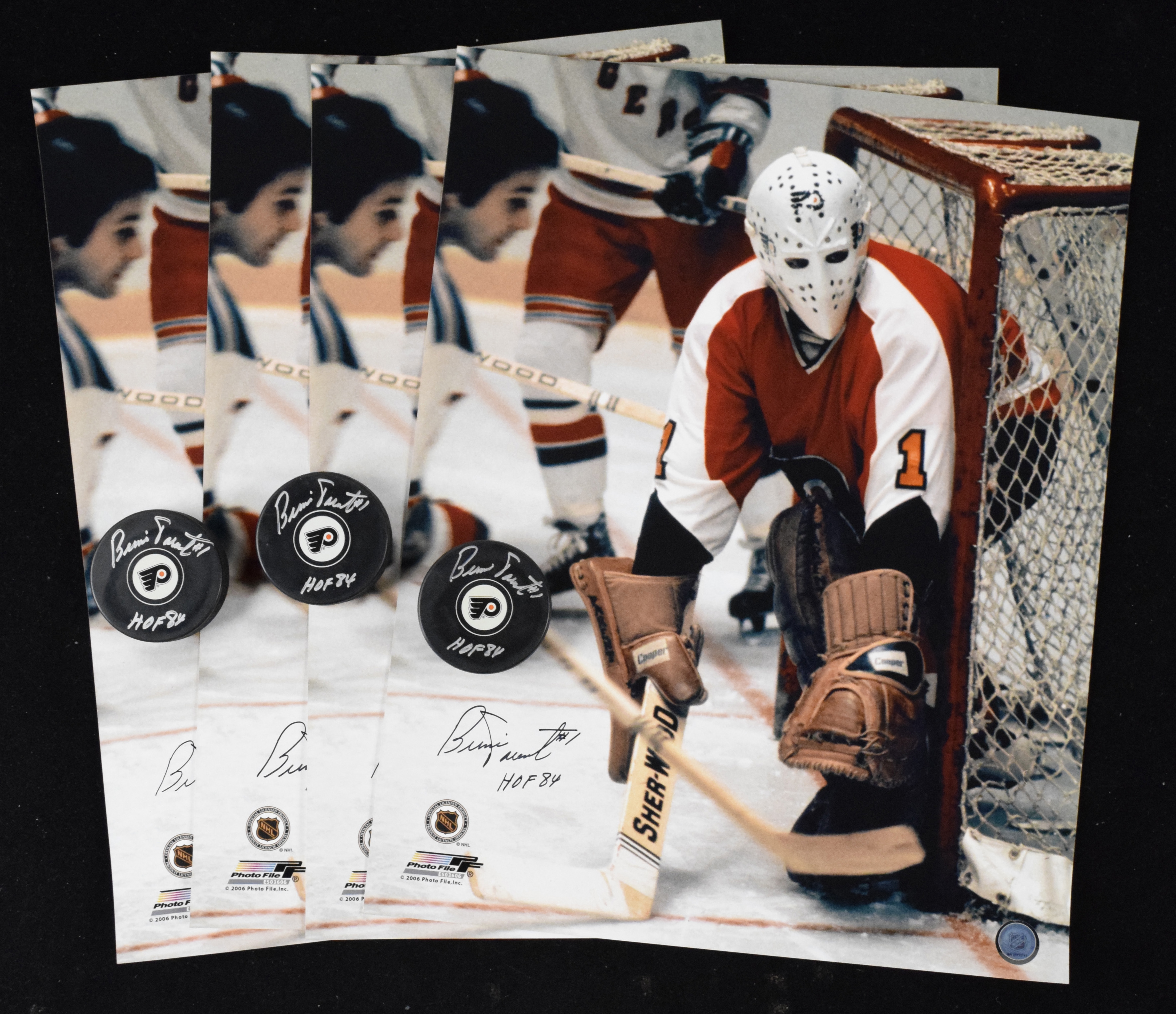 Description:Lot of (6) Bernie Parent signed & inscribed hockey pucks and (4) signed & inscribed 16"x20" photos (NM-NM/MT). Includes (6) Philadelphia Flyers pucks signed by Parent with "HOF 84" inscription added to each, and (4) 16"x20" photos signed by Parent with "HOF 84" inscription added to each. Signatures rate 7/8 to 10 (avg 8/9) out of 10: NM-NM/MT