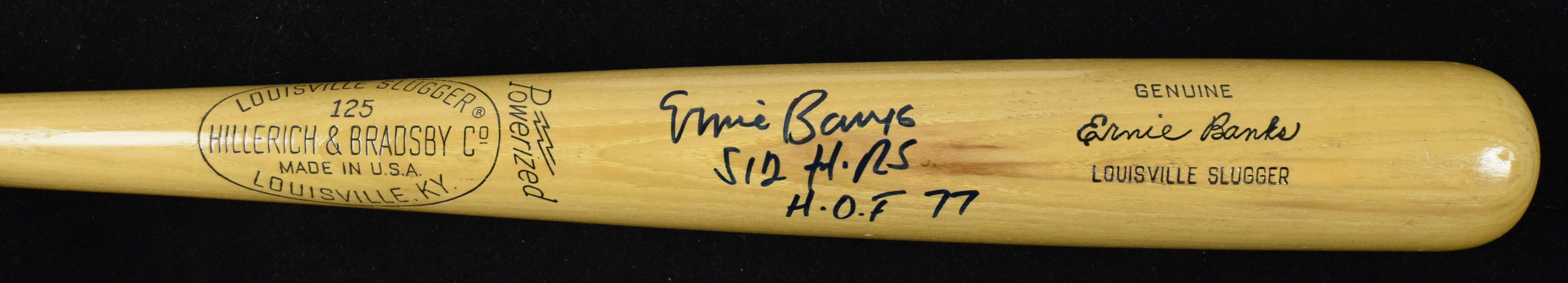 Description:Ernie Banks signed and inscribed vintage store model baseball bat (NM). Unused c.1960s 34" Louisville Slugger EB4 Ernie Banks model bat signed by Banks in blue marker with "512 HRs" "HOF 77" inscriptions. Signature rates 9 out of 10: NM