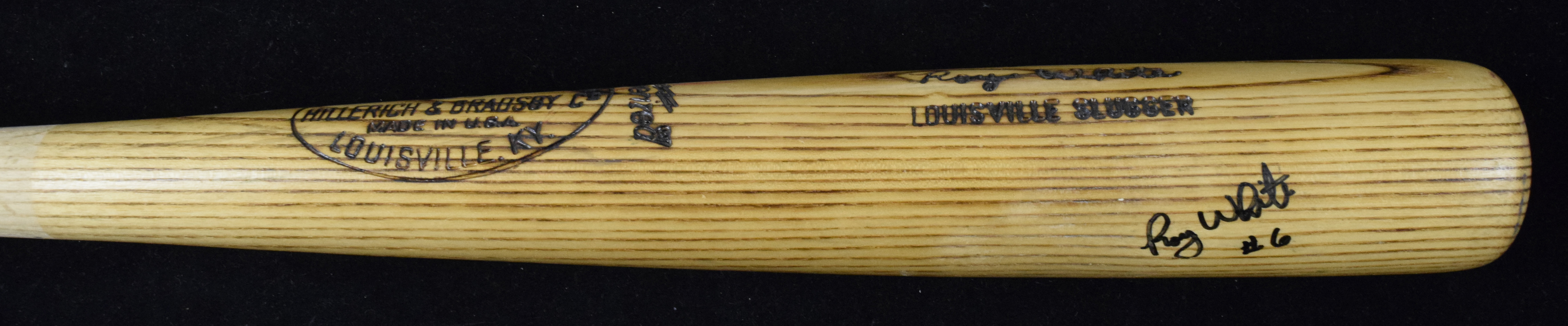 Description:Roy White signed professional model baseball bat, c.1977-79 (VG). 34" Louisville Slugger R143 Roy White model bat with #46 written on the knob (worn by Mike Heath and Gene Locklear in that era). White signed the bat in black marker. Signature rates 8 out of 10. Ball marks, light grain swelling, a few small rack marks, and a handle crack: VG