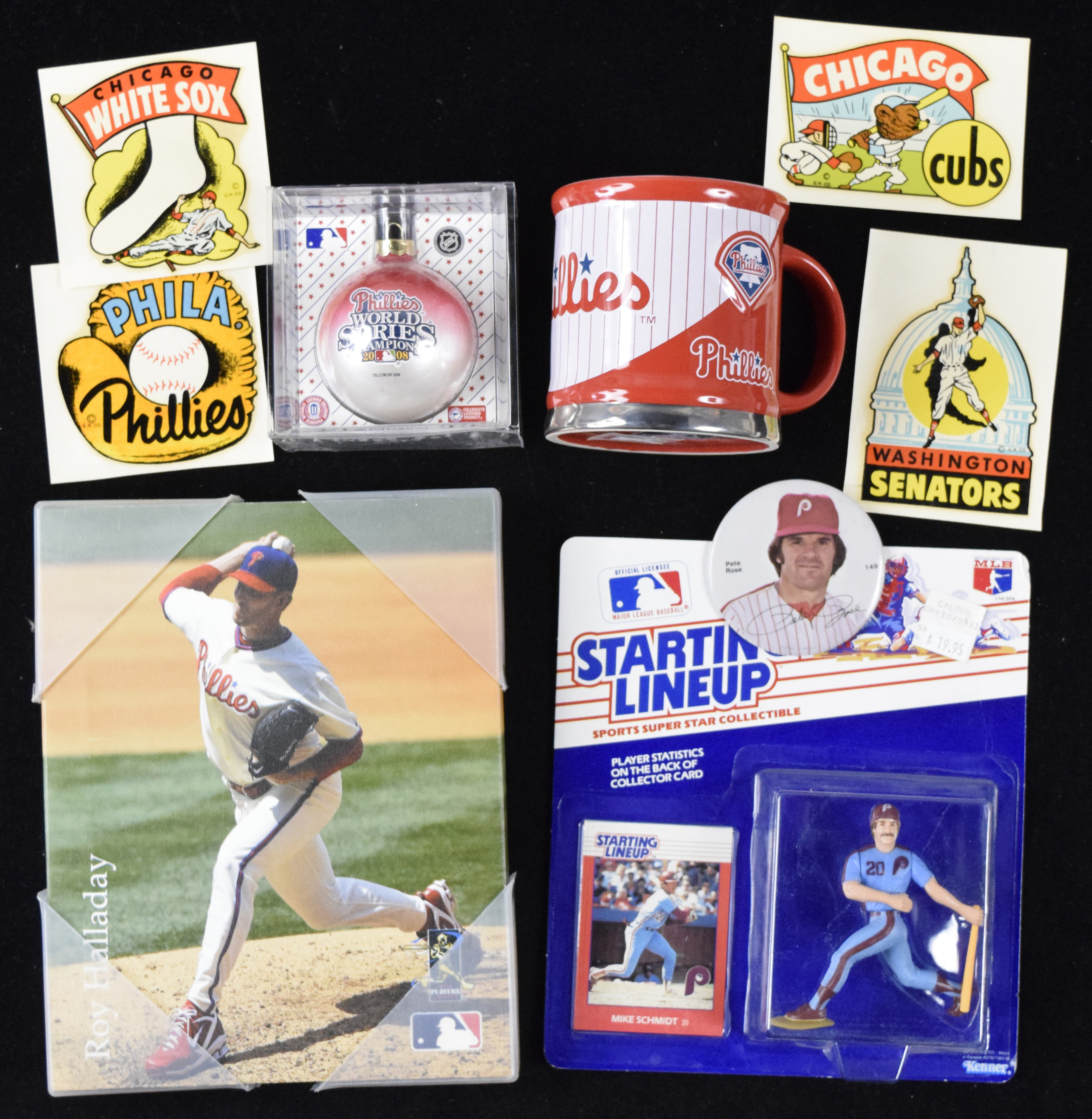 Description:Large lot of assorted baseball souvenirs & novelty items - mostly Philadelphia Phillies (NM-NM/MT overall). Includes two large boxes of display pieces, mugs, souvenir baseballs, and many other baseball novelty items. The majority are Phillies related, with some other teams mixed in: NM-NM/MT overall