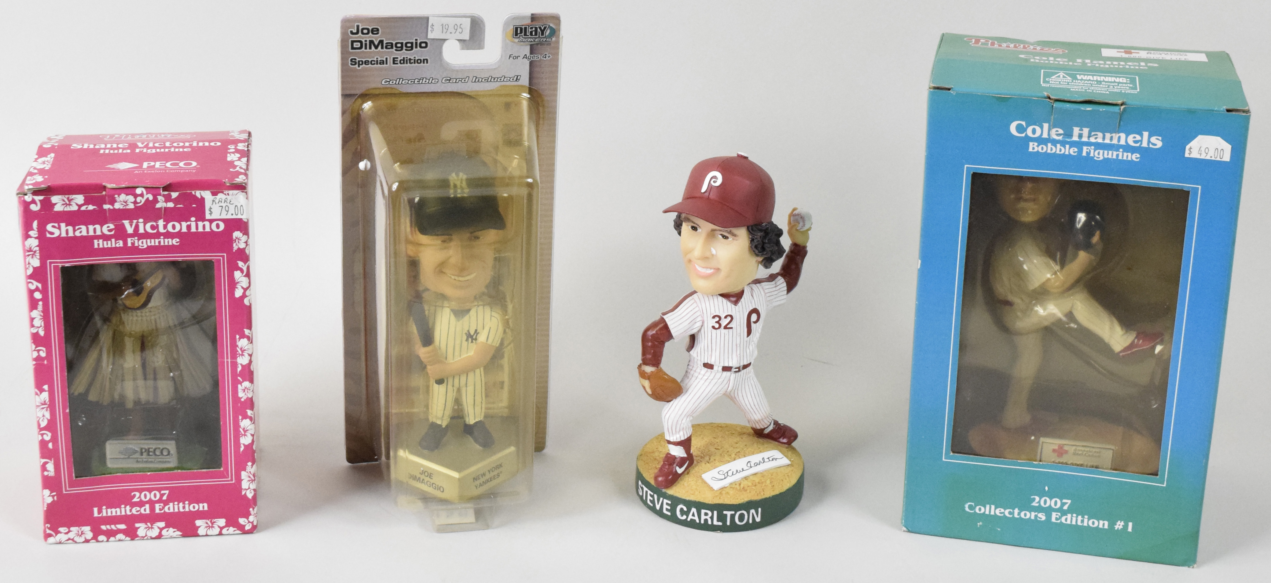 Description:Lot of (11) bobbleheads including SGAs and signed Carlton (NM overall). Stadium giveaways include Steve Carlton (signed by Carlton), (3) Richie Ashburn / Harry Kalas, (2) Mike Schmidt, Cole Hamels, and Shane Victorino. Also includes (2) Joe DiMaggio 2003 Upper Deck PlayMakers, and a Donald Trump from Trump Marina Hotel Casino: NM overall