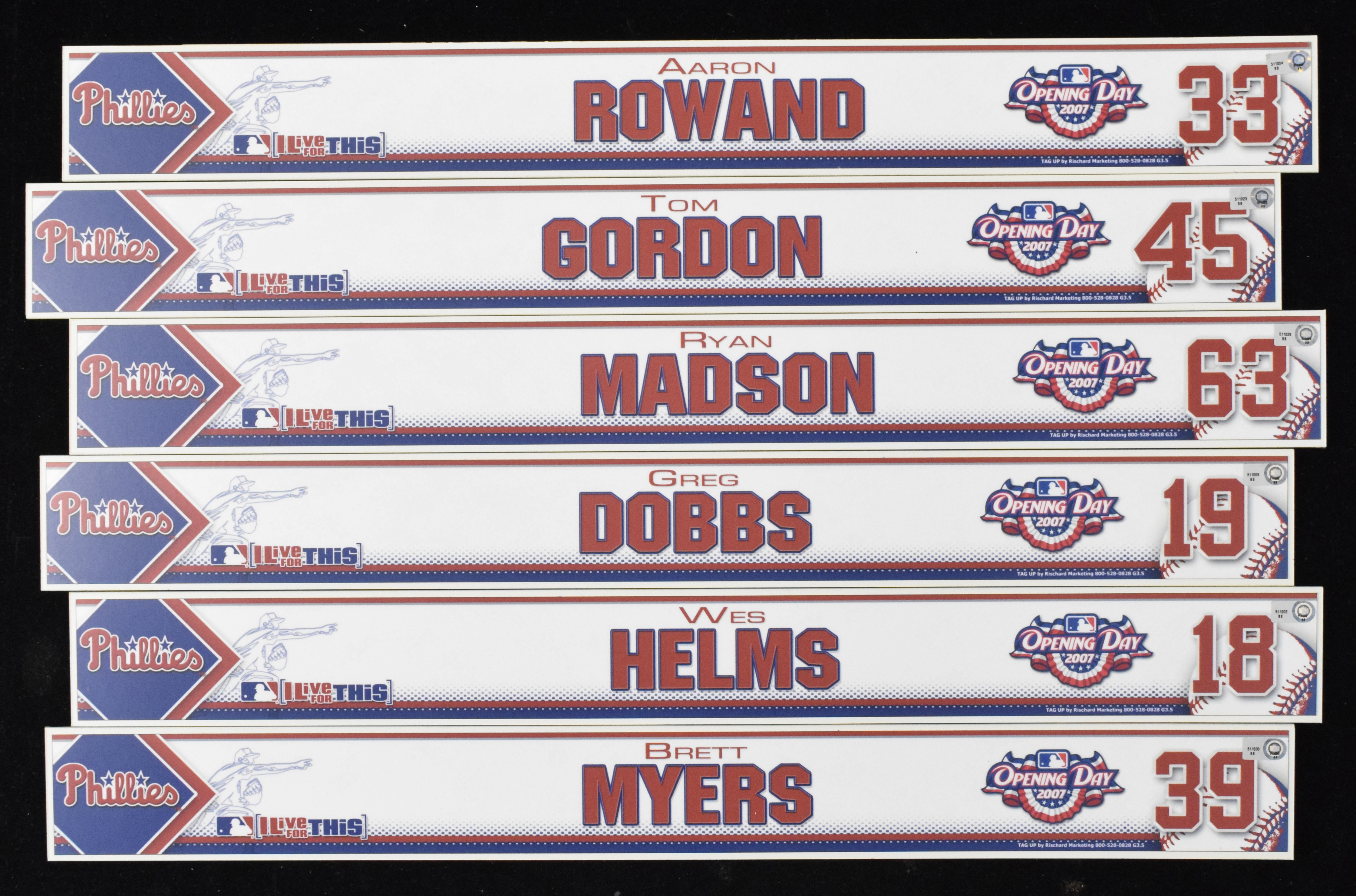 Description:Lot of (6) Philadelphia Phillies 2007 Opening Day locker name tags - MLB Authenticated (EX-NM). Includes Aaron Rowand, Tom Gordon, Ryan Madson, Greg Dobbs, Wes Helms, and Brett Myers. MLB Authenticated serial #ed hologram sticker is on each tag: EX-NM