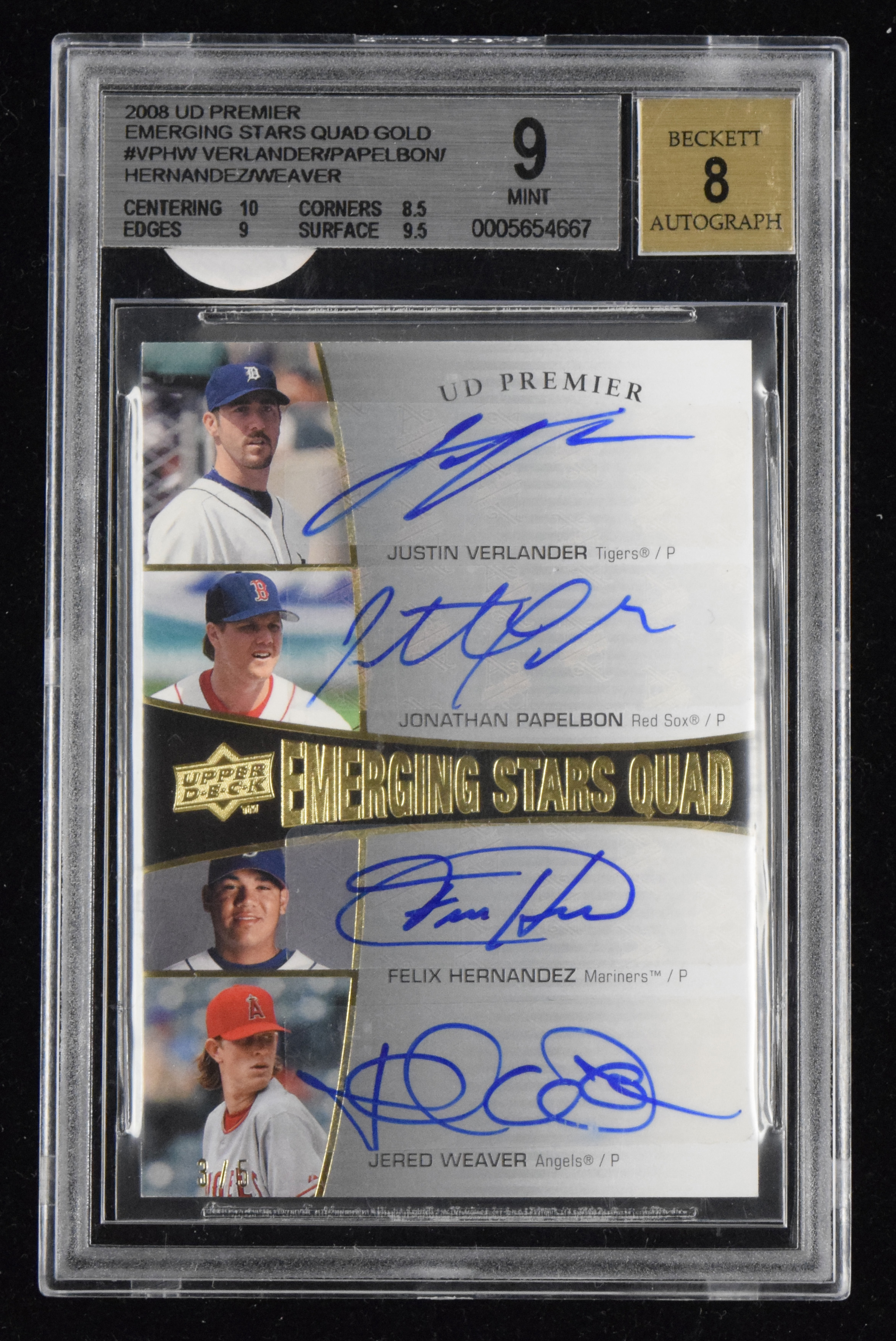 Description:2008 UD Premier Emerging Stars Quad Gold autographed card with Verlander (BGS 9; 8 Auto). Very tough quad signatures card #ESQ-VPHW has been signed in blue ink by Justin Verlander, Jonathan Papelbon, Felix Hernandez and Jered Weaver and encapsulated by Beckett with a card grade of 9 MT and autograph grade of 8 NM/MT: BGS 9 MT; 8 Auto.