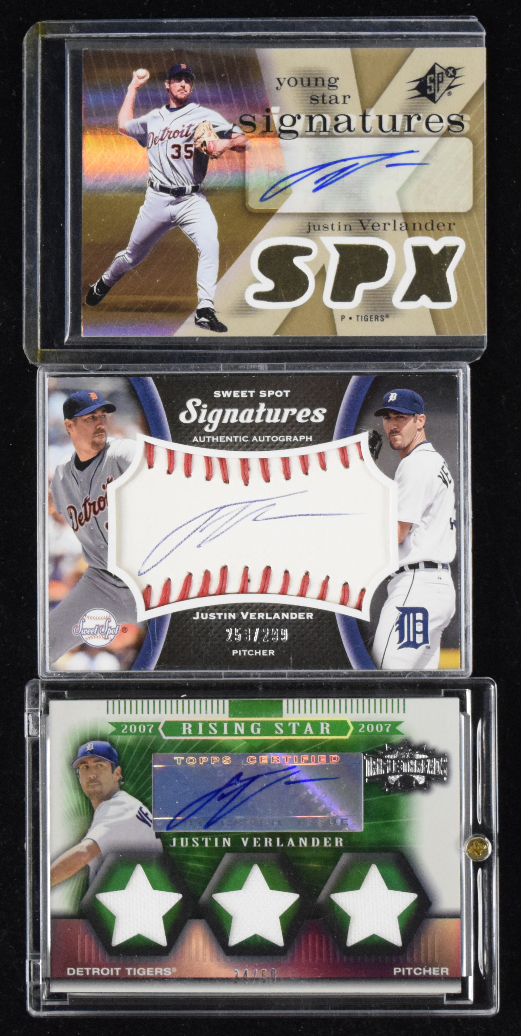 Description:Lot of (3) 2007-2008 Justin Verlander certified autograph cards (MT). Nice lot of pack-pulled autograph cards, with 2007 SPx Young Star Signatures #YS-JV; 2007 Topps Triple Threads #130 Emerald (34/50); and 2008 Upper Deck Sweet Spot Signatures #S-JV (253/299). Signatures rate 9 out of 10 and cards appear MT.