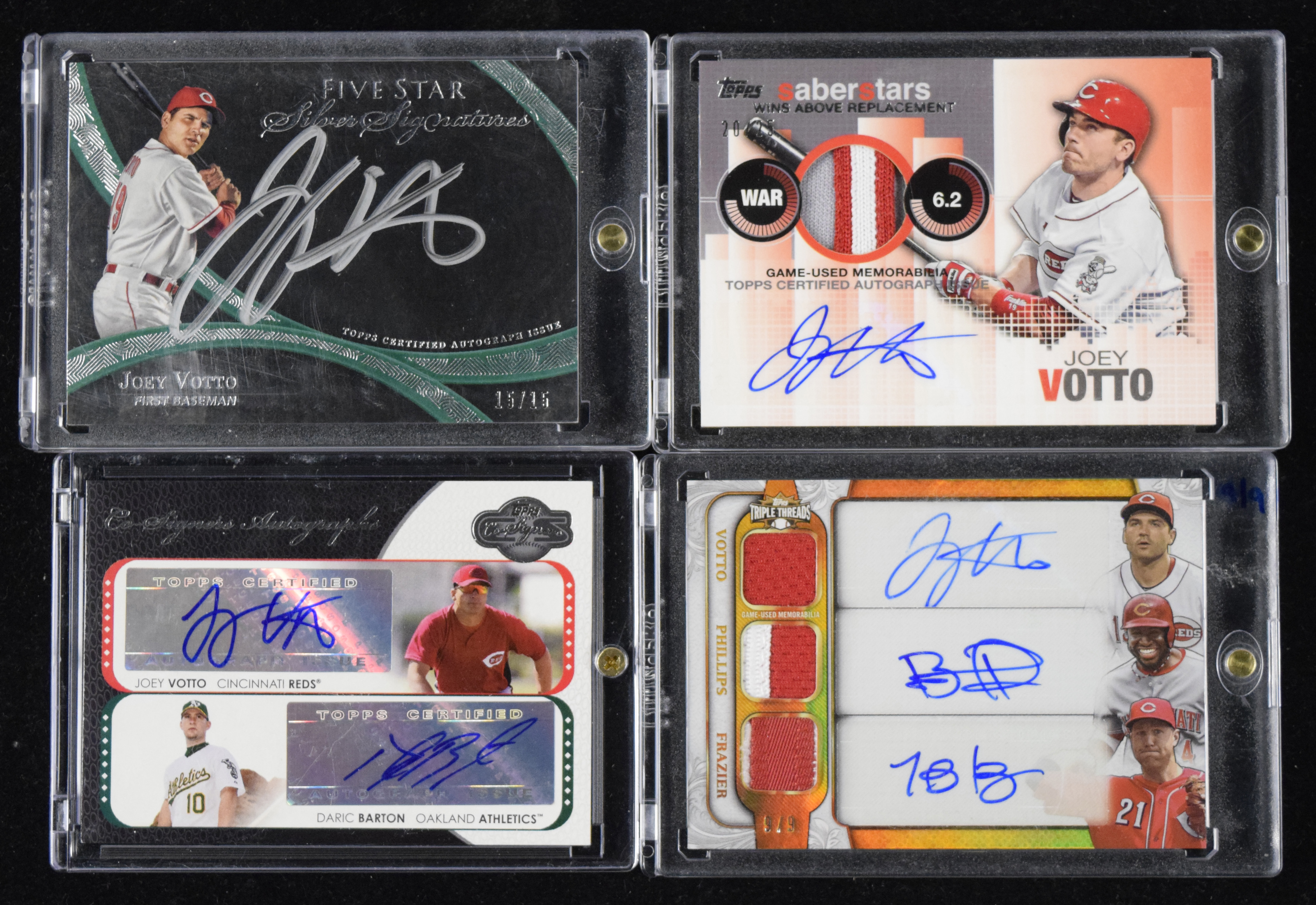 Description:Lot of (10) 2008-2014 Joey Votto certified autograph cards (MT). Nice lot of pack-pulled modern autograph cards, all individually signed by Votto and spanning the years 2008 through 2014, with Topps, Bowman, Upper Deck and more. Several feature game-used memorabilia swatches, and some are numbered (as low as 9/9). Signatures rate 9 out of 10 and cards appear MT.