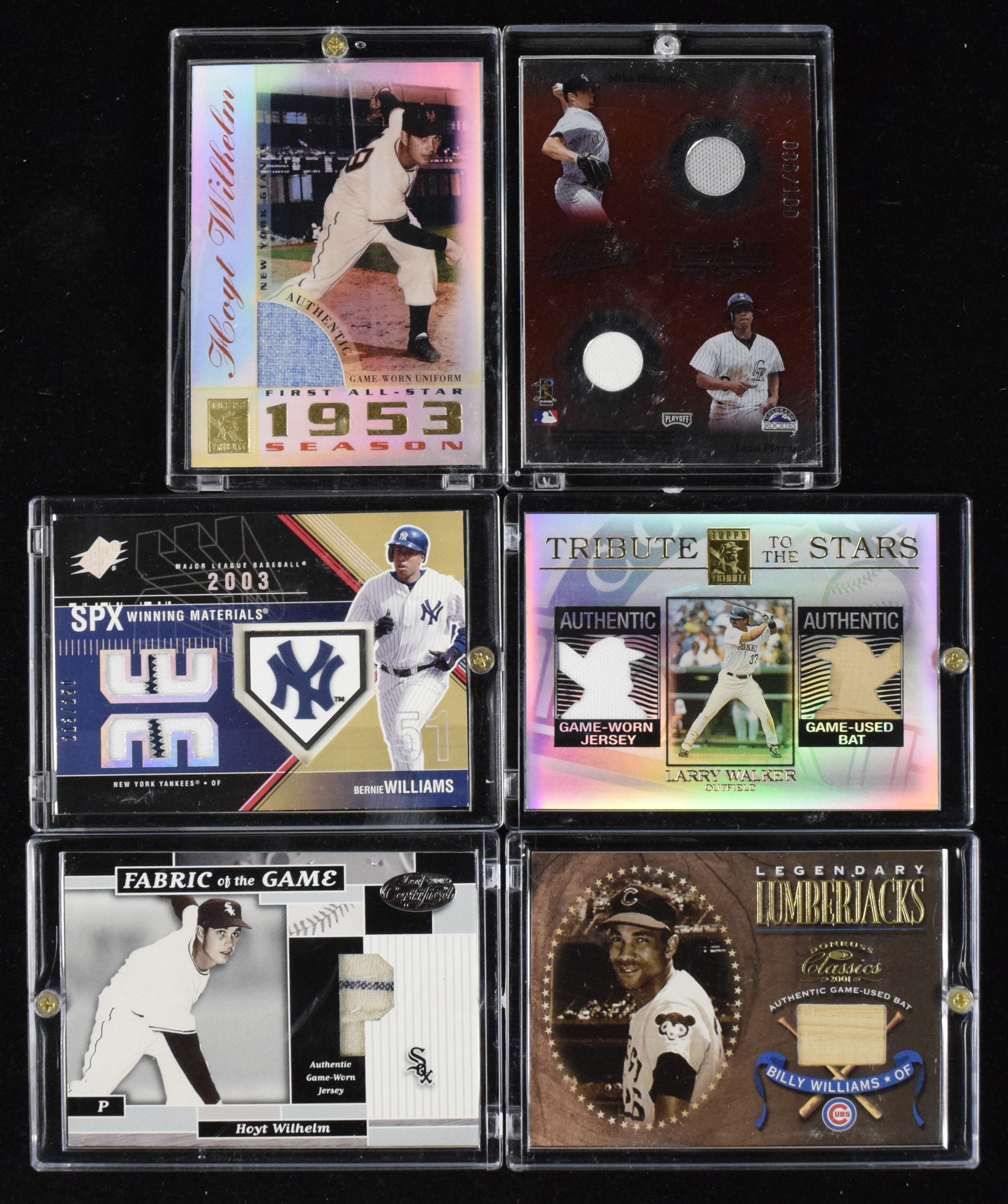 Description:Lot of (79) modern game-used memorabilia cards (MT). Outstanding quantity of pack-pulled modern game-used memorabilia cards (mostly 2000s) featuring jersey, bat and other relic cards with many numbered, including Fleer, Topps, Upper Deck and more. Most are housed in high-quality screwdown holders or top loaders. Players include Bernie Williams, Matt Williams, many Larry Walker, Billy Williams, David Wells, Todd Helton, Hoyt Wilhelm, and Joey Votto. Most cards appear MT or better.