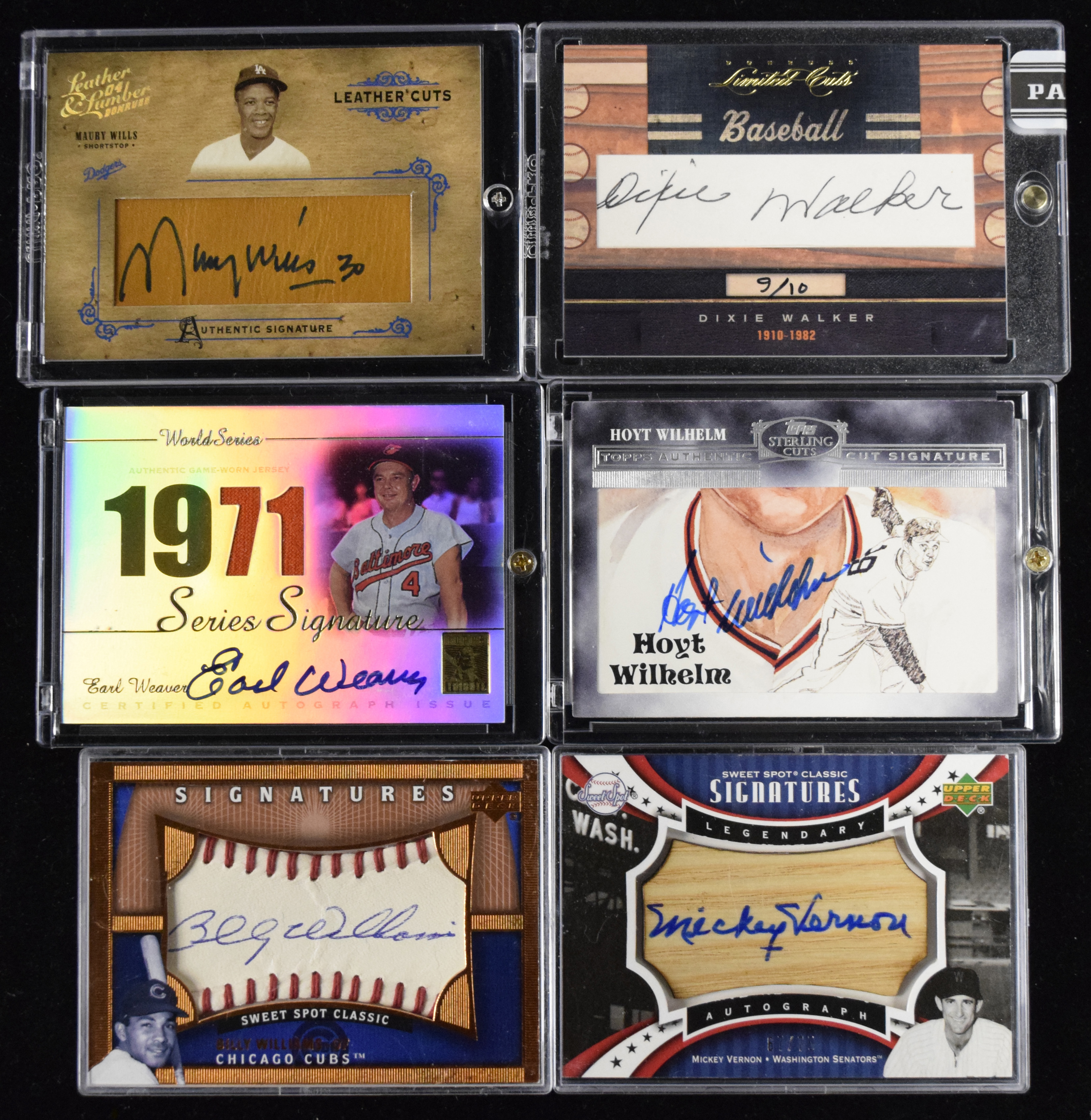 Description:Lot of (10) modern certified autograph cards with vintage players, including Wills and Williams (MT). Outstanding lot of pack-pulled modern (mostly 2000s) autograph cards with some numbered or featuring game-used memorabilia swatches, with Donruss, Upper Deck, Topps and more. All are housed in high-quality screwdown holders or top loaders. Players include (2) diff. Maury Wills, Dixie Walker, Earl Weaver, Mickey Vernon, (2) diff. Hoyt Wilhelm, (2) diff. Billy Williams and Vic Wertz. Most signatures and cards appear MT or better.