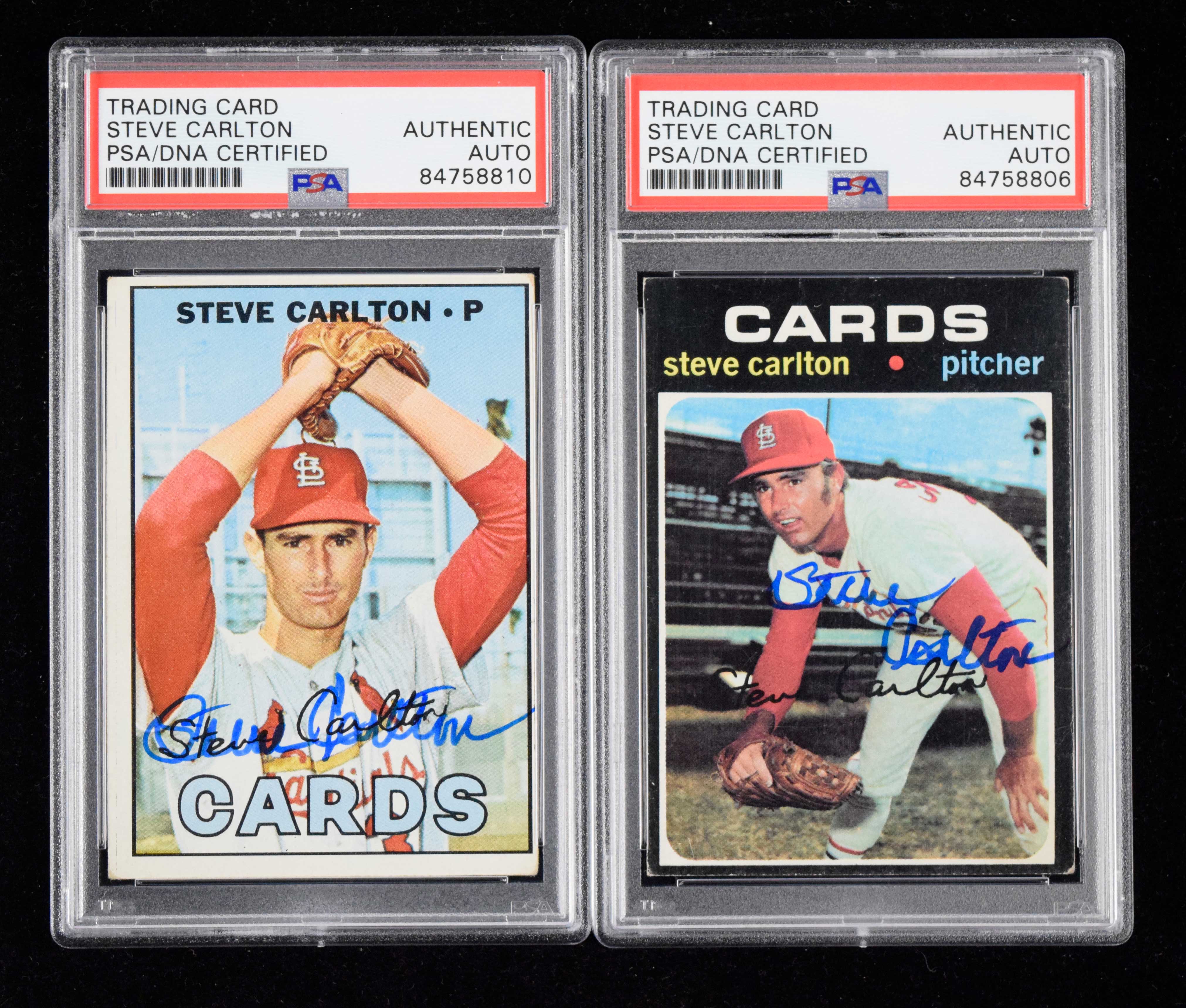 Description:Steve Carlton signed 1967 and 1971 Topps Baseball cards - PSA/DNA (VG-EX/MT). Includes 1967 Topps #146 signed by Carlton (VG), and 1971 Topps #55 signed by Carlton (EX-EX/MT). Signatures rate 8/9 to 10 out of 10. Both are encased within PSA/DNA Authentic holders: VG-EX/MT