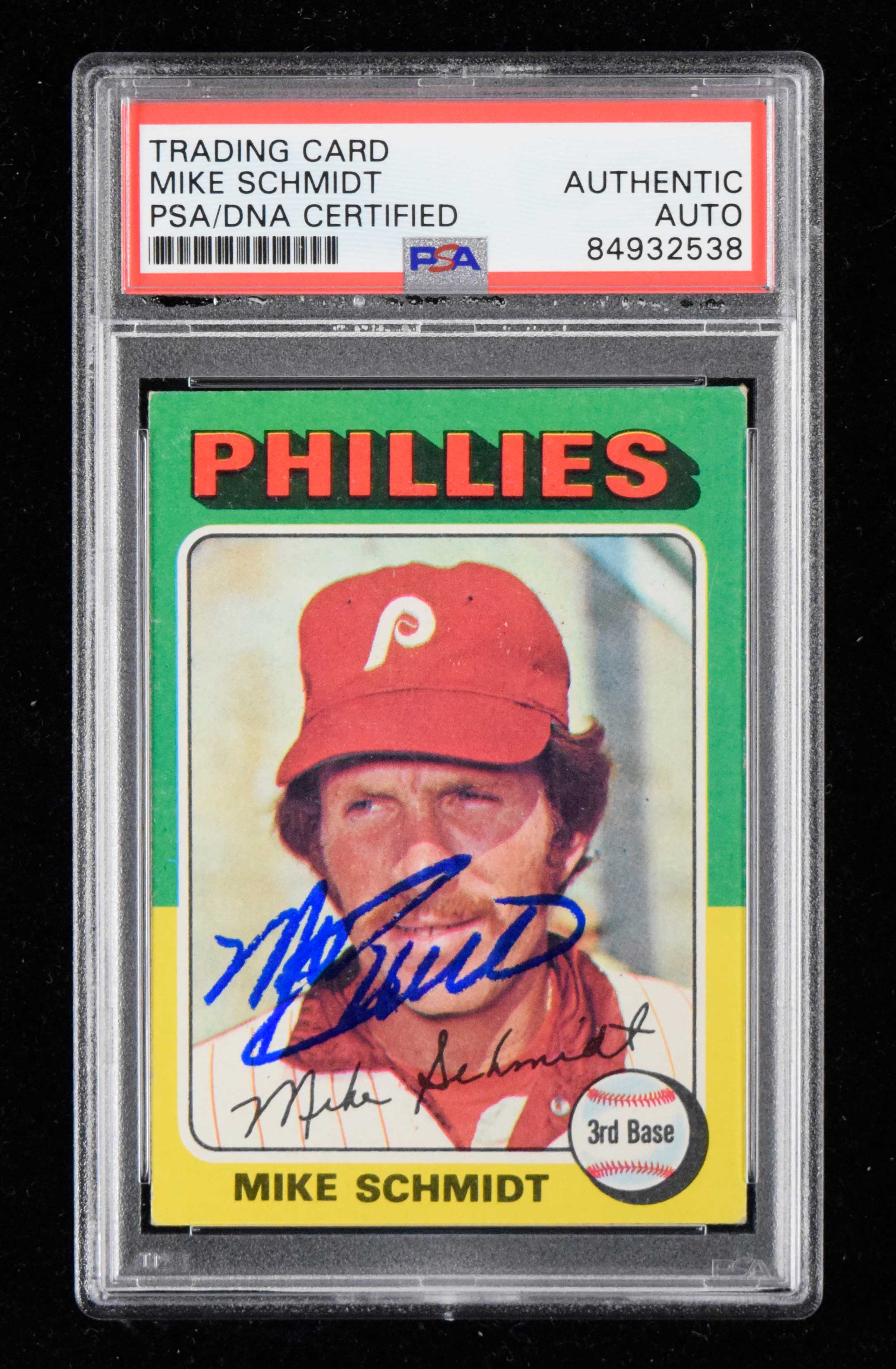 Description:Mike Schmidt signed 1975 Topps Baseball card - PSA/DNA (EX-EX/MT). 1975 Topps #70 signed by Schmidt in blue marker. Signature rates 9 out of 10. Encased within PSA/DNA Authentic holder. Minor corner wear: EX-EX/MT