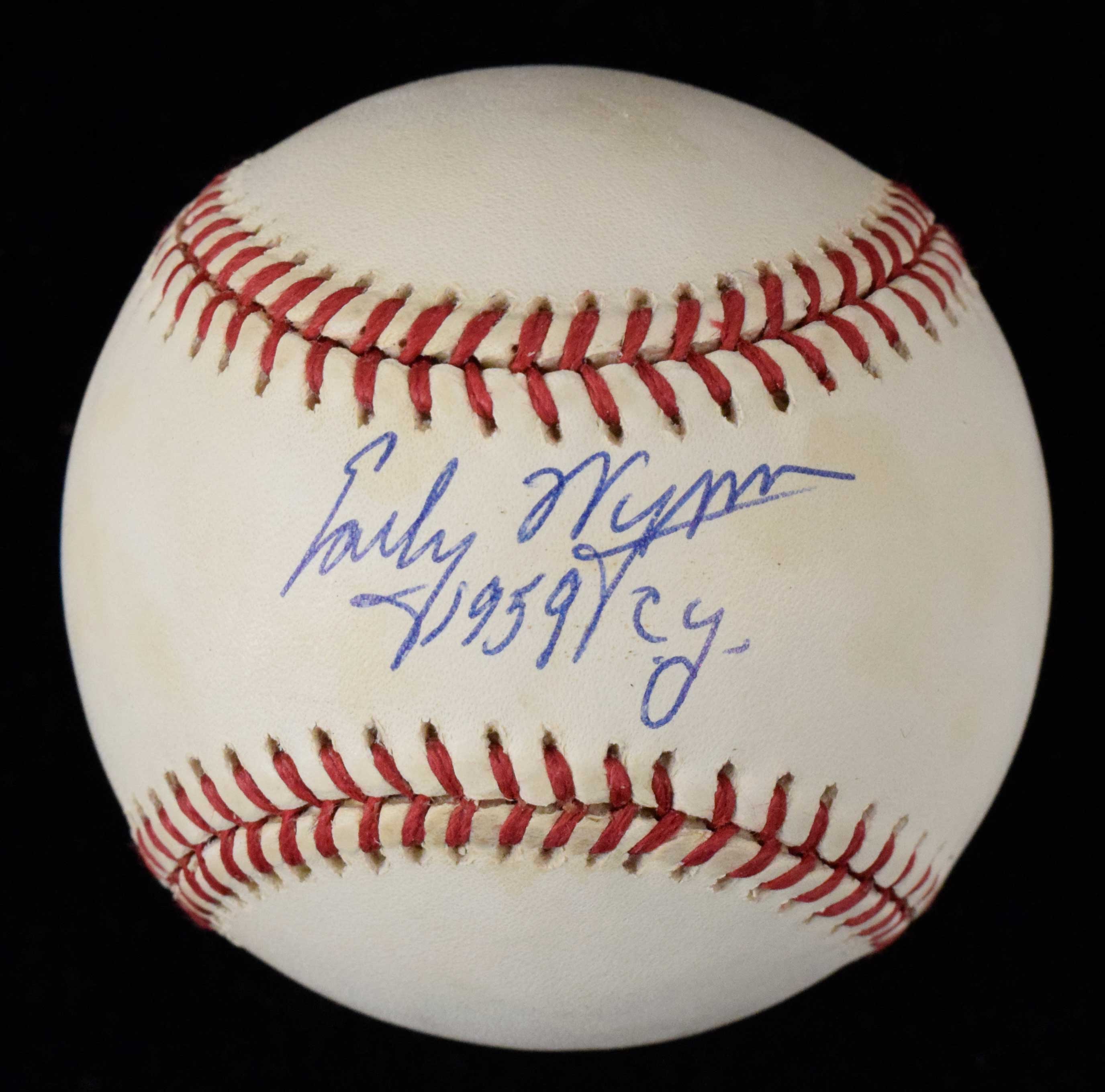 Description:Early Wynn signed and inscribed G.Budig AL baseball (EX). Wynn signed the sweet spot in blue ink and added "1959 Cy" inscription. Signature rates 9 out of 10. Light to moderate toning on each panel: EX