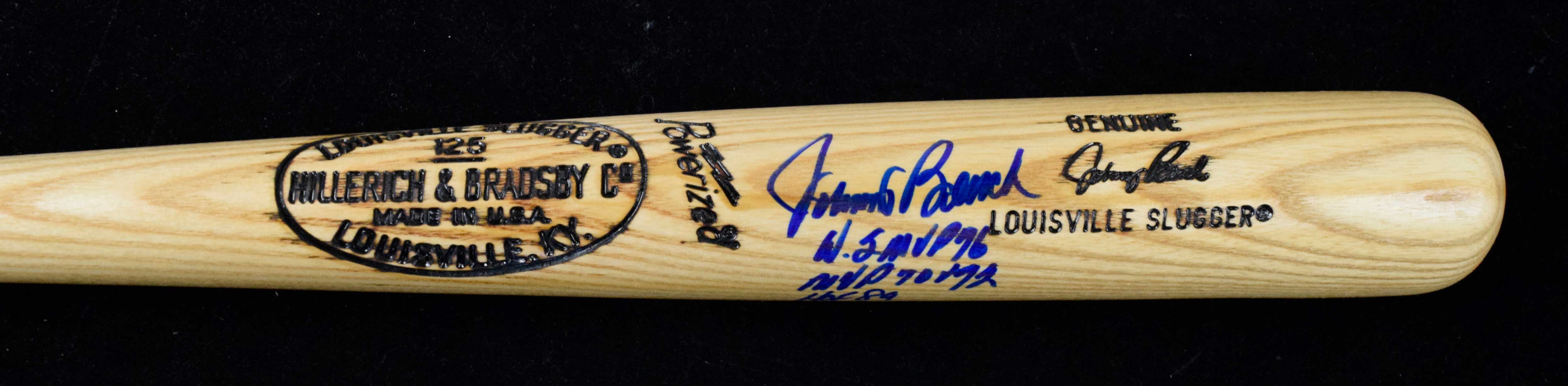 Description:Johnny Bench signed and multi-inscribed replica model baseball bat (NM). 35" Louisville Slugger B278 Johnny Bench show model bat signed by Bench in blue marker with "HOF 89" "MVP 70+72" "WS MP 76" inscriptions. Signature rates 8/9 out of 10: NM
