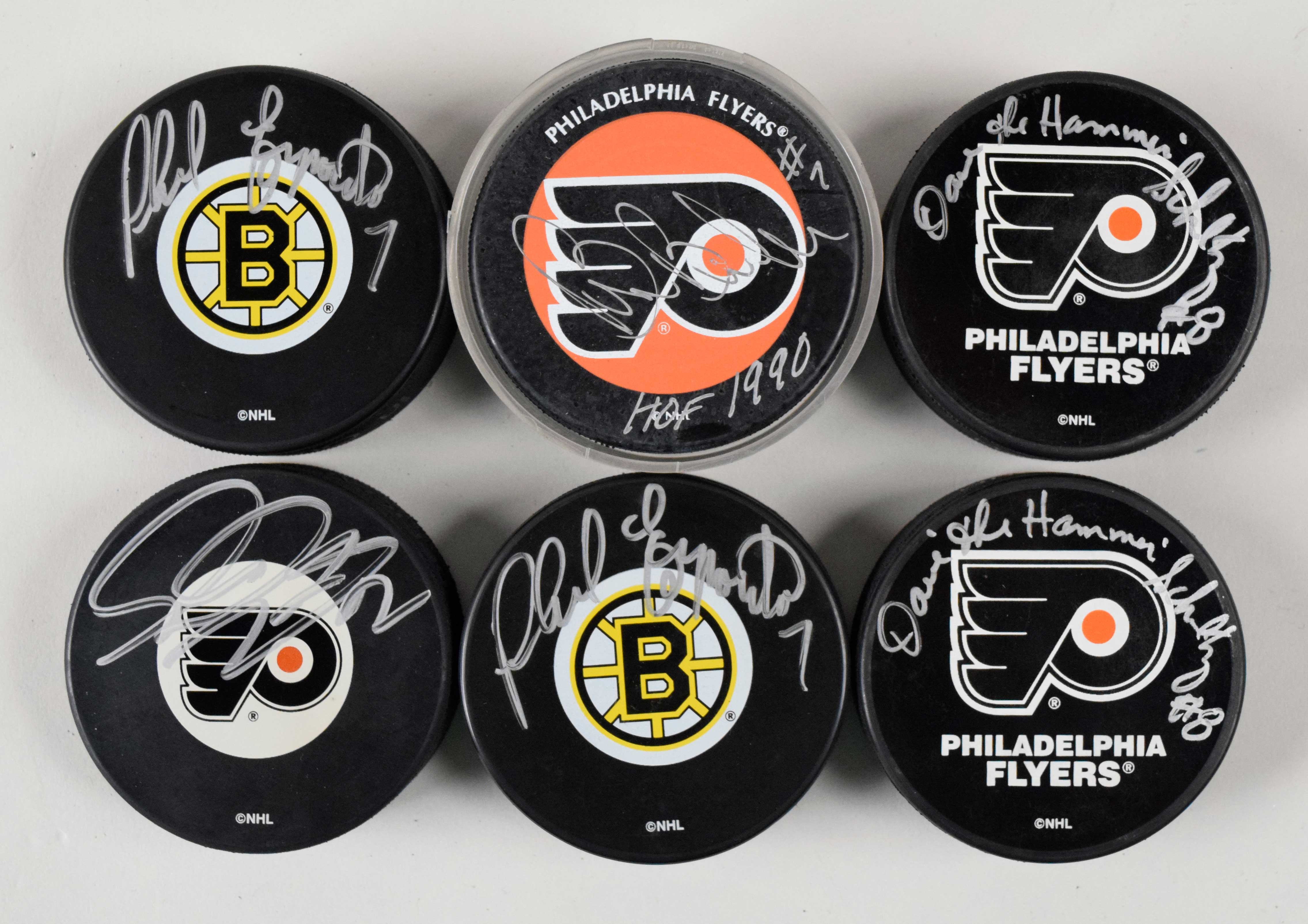 Description:Lot of (9) signed hockey pucks (NM-NM/MT). Includes (2) Boston Bruins pucks signed by Phil Esposito, Philadelphia Flyers puck signed by Bill Barber with "HOF 1990" inscription, (3) Flyers pucks signed by Dave "The Hammer" Schultz, and (3) Flyers pucks signed by Simon Gagne. Signatures rate 7/8 to 10 (avg 8/9) out of 10: NM-NM/MT