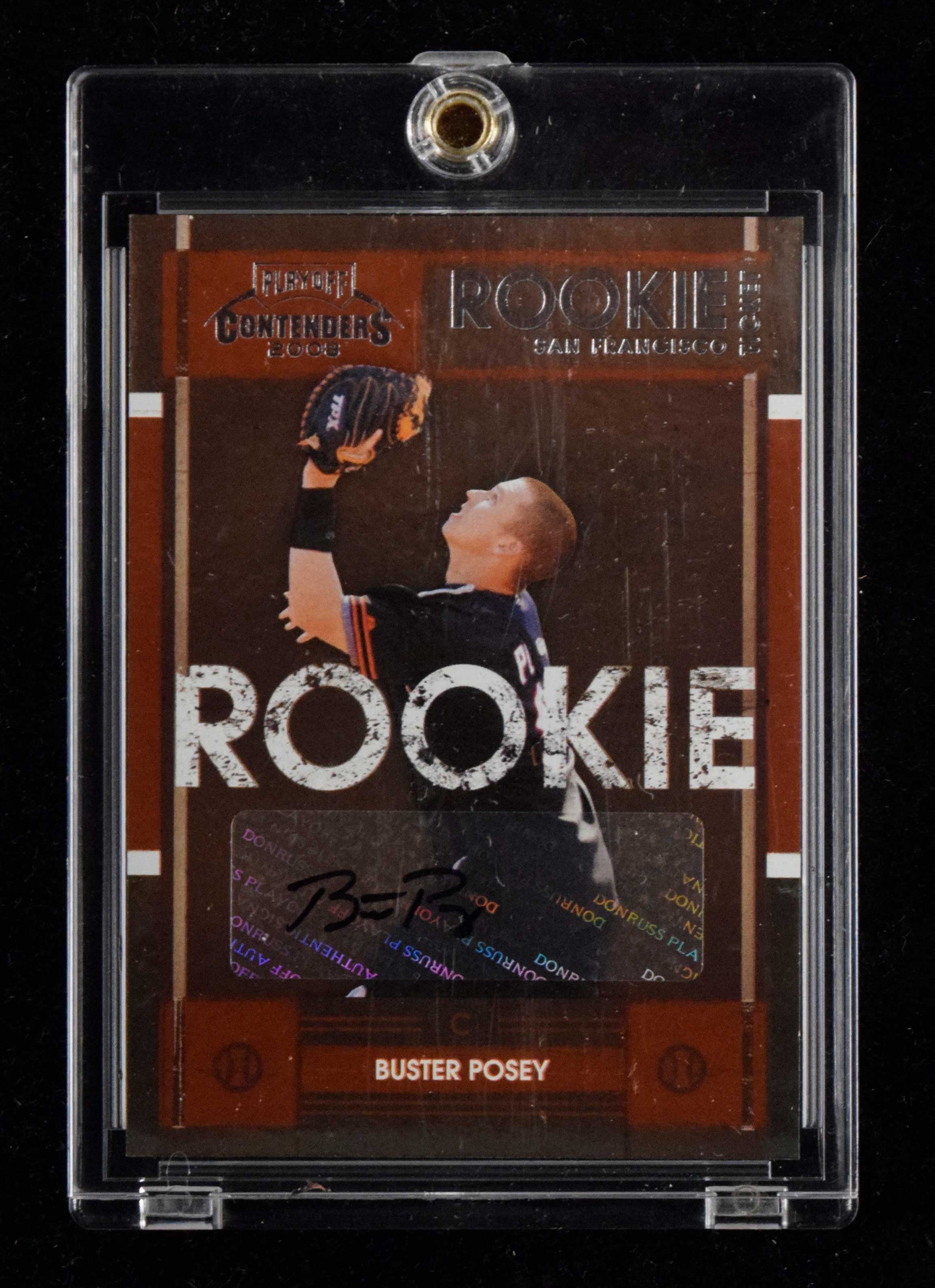 Description:Buster Posey signed 2008 Playoff Contenders rookie card (NM). 2008 Playoff Contenders #63 signed by Posry in black marker. Signature rates 9/10 out of 10: NM