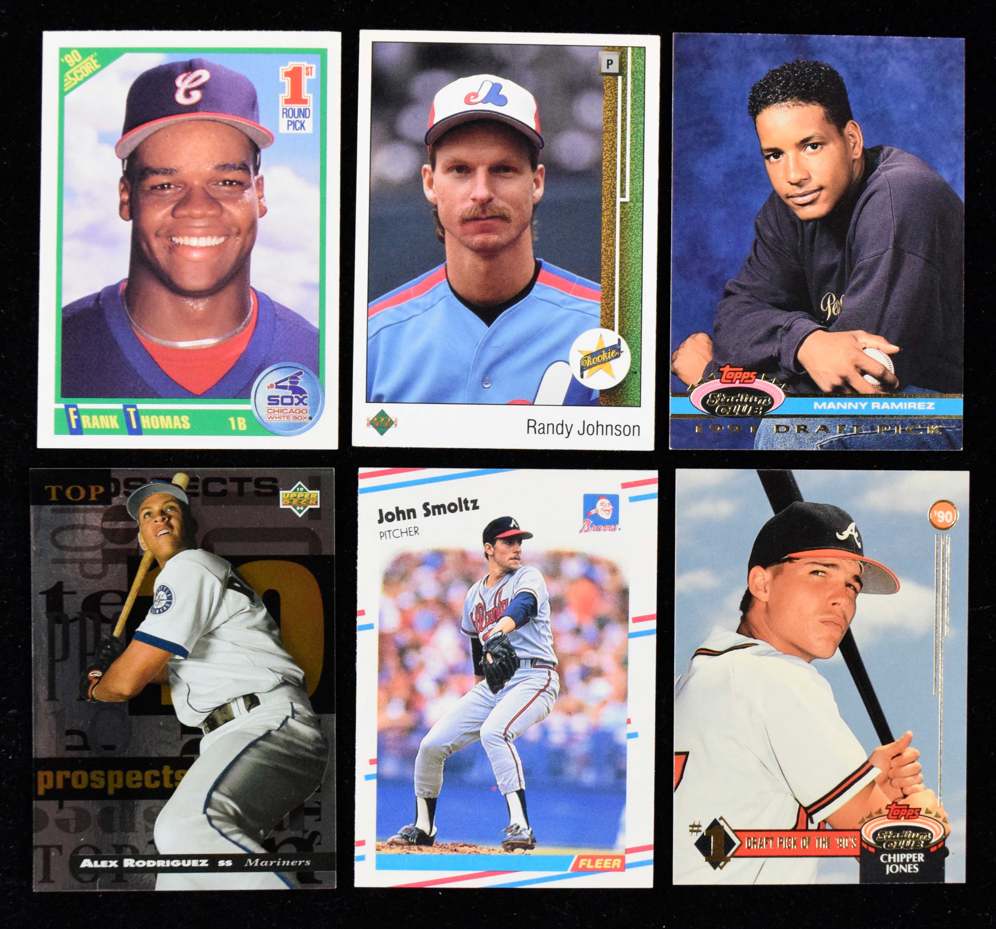 Lot of (14) stars & HOFers baseball cards from 1988-2002 - mostly rookies (NM-NM/MT overall). Includes 1988 Fleer Update #s U-74 John Smoltz, U-89 Craig Biggio, and U-122 Roberto Alomar; 1989 Upper Deck #s 17 Smoltz and 25 Randy Johnson; 1990 Score #663 Frank Thomas; 1991 Topps Stadium Club Dome #146 Manny Ramirez; 1992 Stadium Club "First Draft Picks" #1 Chipper Jones; 1994 Upper Deck Minor League "Top 10 Prospects" #8 Alex Rodriguez; 1999 Topps Traded #T66 Josh Hamilton; 1999 Bowman Chrome #431 Hamilton; 2000 SP Authentic #112 Alfonso Soriano (#ed 1570/2500), 2001 Upper Deck Sweet Spot Update #138 Mark Teixeira (#ed 710/1500), and 2002 SP Authentic "Limited Gold" #59 Mark Prior (#ed 41/50): NM-NM/MT overall