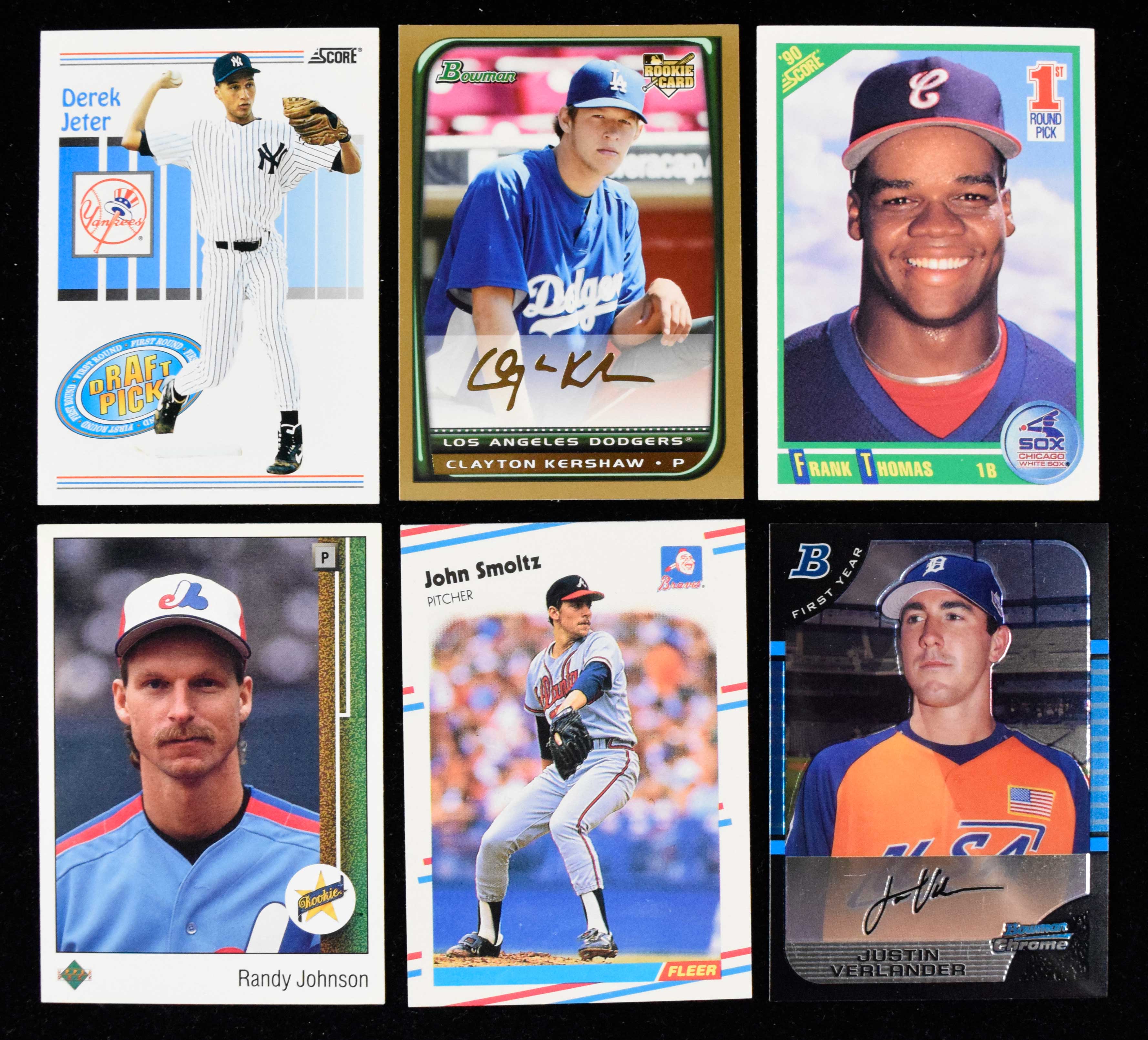 Lot of (14) stars & HOFers baseball cards from 1988-2008 - mostly rookies (NM-NM/MT overall). Includes 1988 Fleer Update #s U-74 John Smoltz, U-89 Craig Biggio, and U-122 Roberto Alomar; 1989 Upper Deck #s 17 Smoltz and 25 Randy Johnson; 1990 Score #663 Frank Thomas; 1992 Bowman #532 Manny Ramirez; 1993 Score #489 Derek Jeter; 1994 Upper Deck Collector's Choice "Silver Signature" #647 Alex Rodriguez; 1995 Topps Traded #18T Carlos Beltran; 1999 Bowman #431 Josh Hamilton; 2001 Upper Deck Sweet Spot #138 Mark Teixeira (#ed 257/1500); 2005 Bowman Draft Picks & Prospects "Chrome" #BDP129 Justin Verlander; and 2008 Bowman Draft Picks & Prospects "Gold" #BDP26 Clayton Kershaw: NM-NM/MT overall