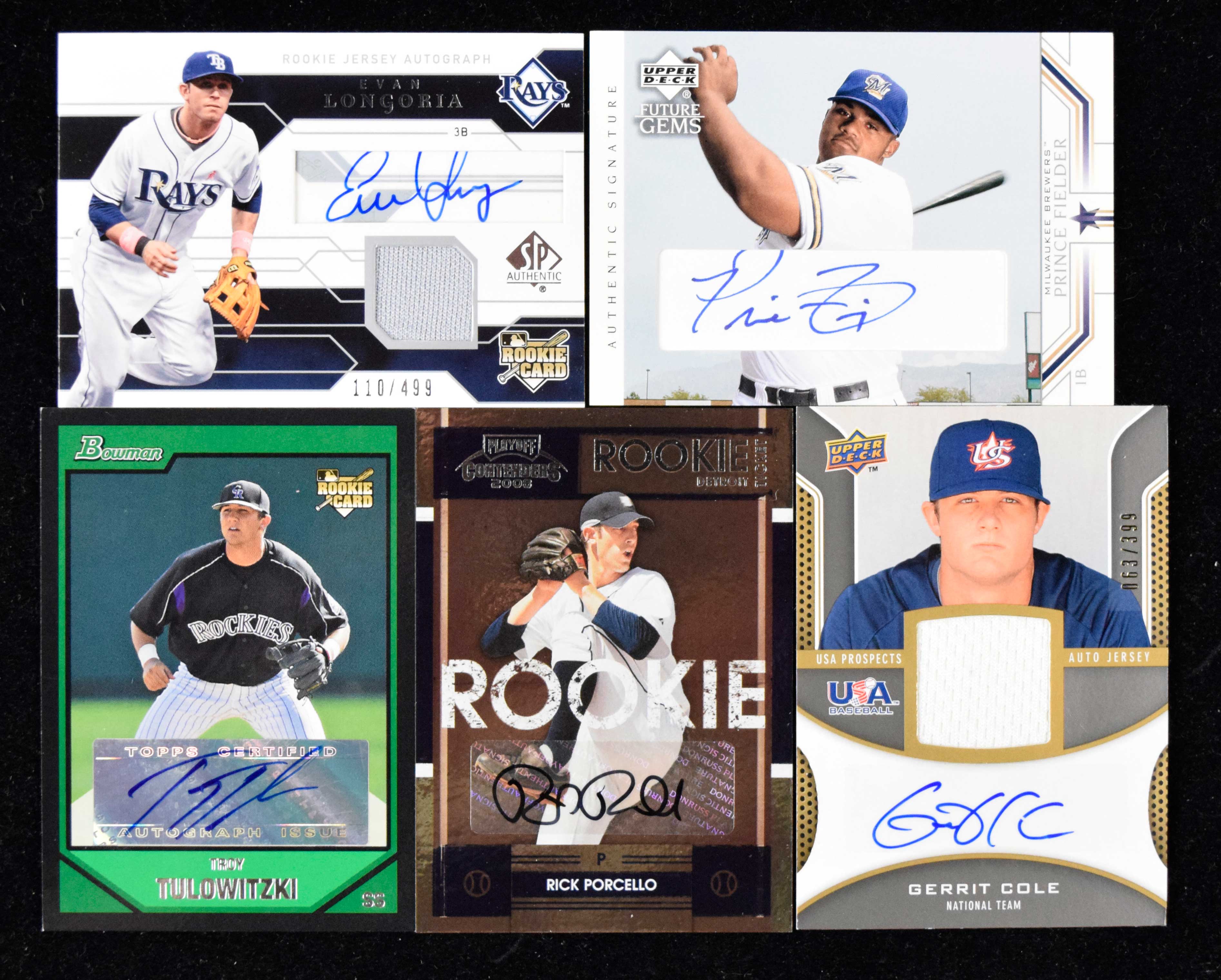 Description:Lot of (10) signed rookie cards including Gerrit Cole (NM-NM/MT overall). Includes 2002 Upper Deck Prospect Premieres #92 signed by Prince Fielder, 2005 Bowman Chrome #349 signed by Matt Kemp, 2006 Bowman Chrome #221 signed by Prince Fielder, 2007 Bowman #222 signed by Trot Tulowitzki, 2008 Bowman Draft Picks & Prospects "AFLAC All-American Classic Autographs" #AFLAC-RP signed by Rick Porcello, 2008 Playoff Contenders #117 signed by Rick Porcello, 2008 SP Authentic #s 121 jersey card signed by Evan Longoria (#ed 110/499) and 132 jersey card signed by Jay Bruce (#ed 426/549), 2009 Upper Deck Signature Stars "USA Star Prospects Jersey Autographs" #USA-CO signed by Gerrit Cole (#ed 63/399), and 2012 Bowman Sterling "Rookie Autographs" #BSAR-MM signed by Matt Moore. Signatures rate 8 to 10 out of 10: NM-NM/MT overall