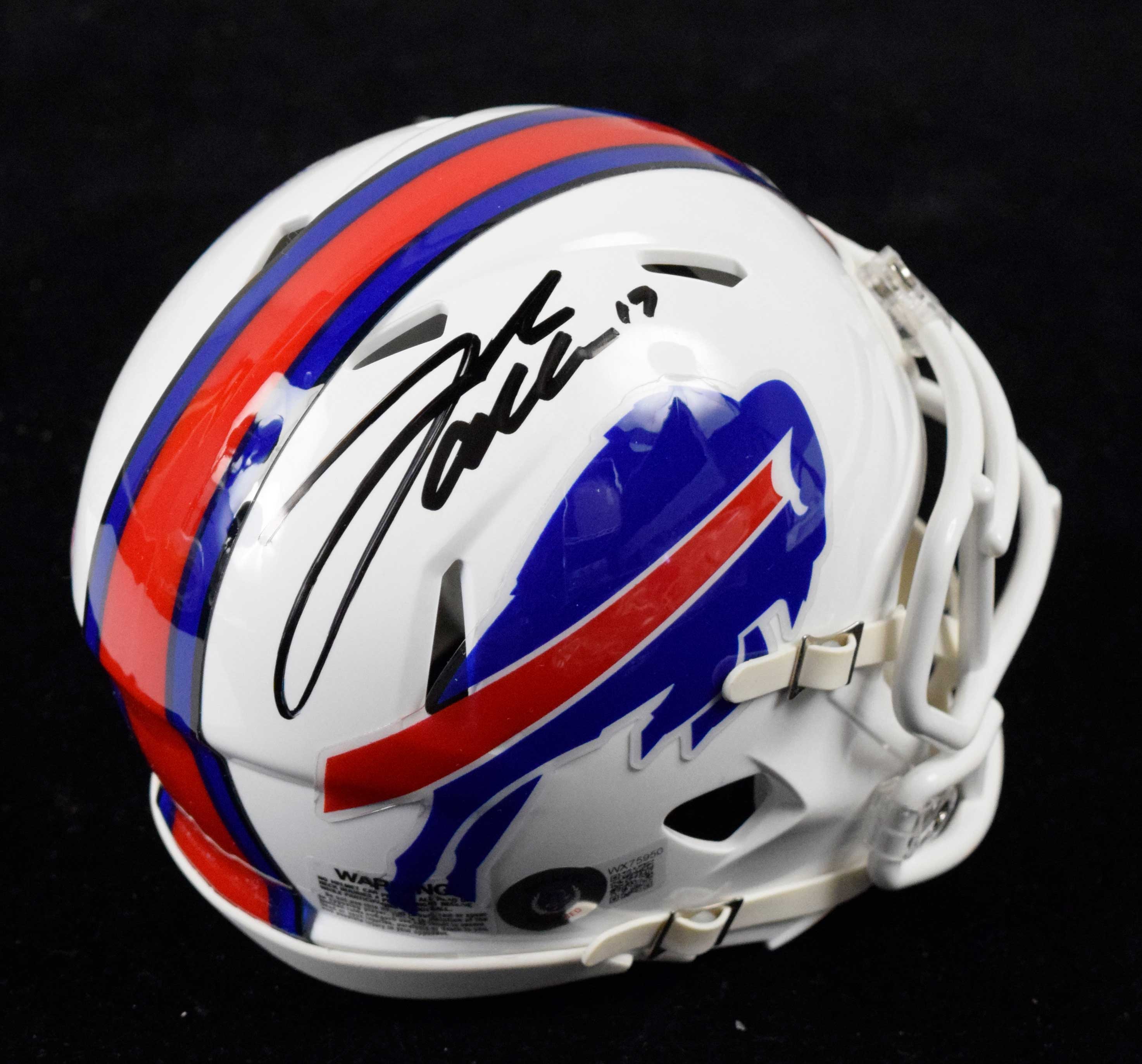 Description:Josh Allen autographed Buffalo Bills mini helmet with Beckett authentication (Sig. MT). Outstanding Riddell Bills helmet has been signed in black marker by Herbert with "17" inscription, rating 9/10 out of 10. A Beckett Witnessed authentication sticker is affixed to the back of the helmet, which has little to no wear: NM/MT.