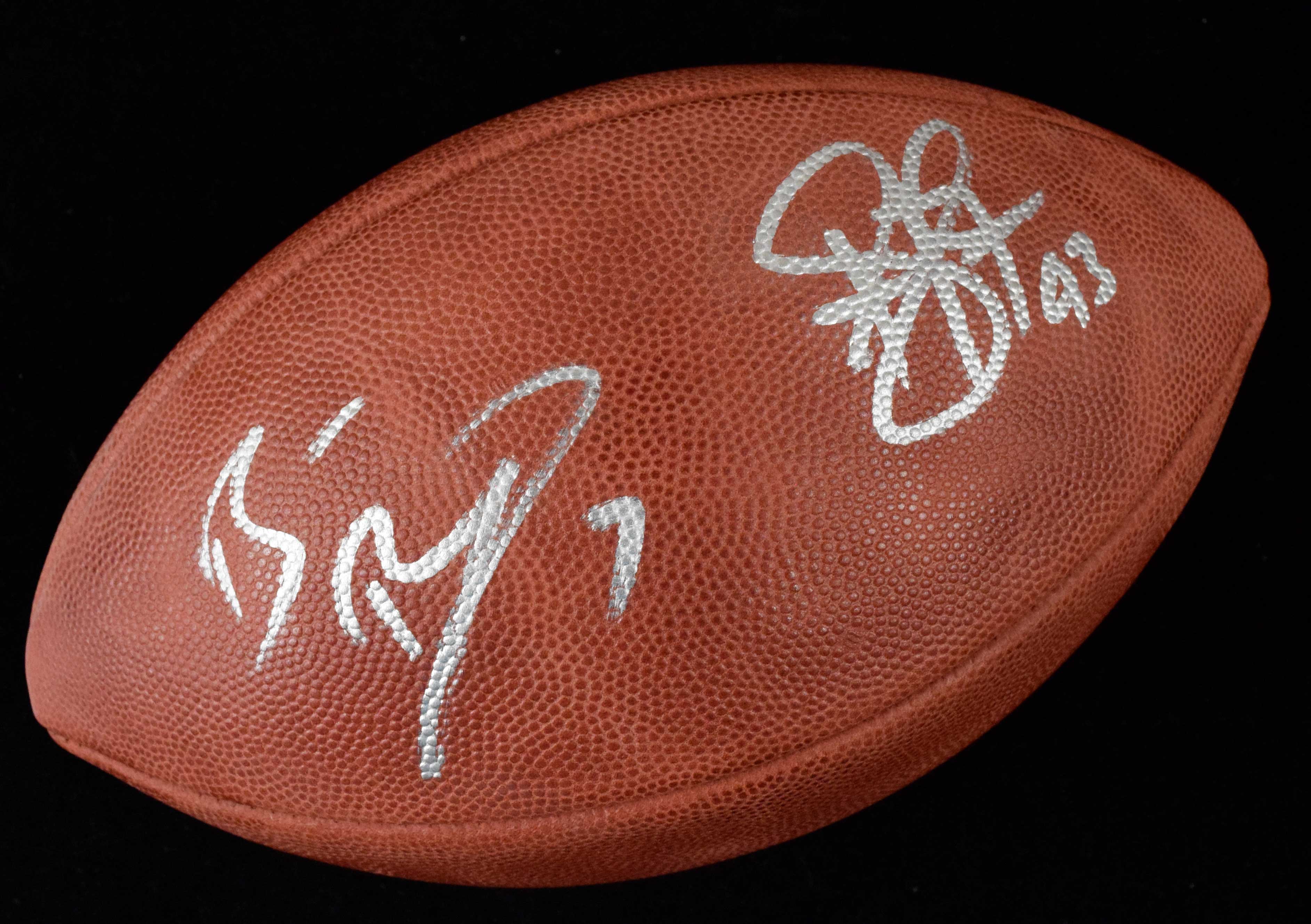Description:Ben Roethlisberger & Troy Polamalu autographed Super Bowl XLII football with Fanatics auth. (Sigs. NM/MT). Like-new Wilson R. Goodell Super Bowl XLII logo football has been signed in silver marker by Roethlisberger and Polamalu in silver with jersey number inscriptions, rating 8/9 out of 10. A Fanatics authentication sticker is affixed to the ball, which is lightly deflated with little to no wear: NM.