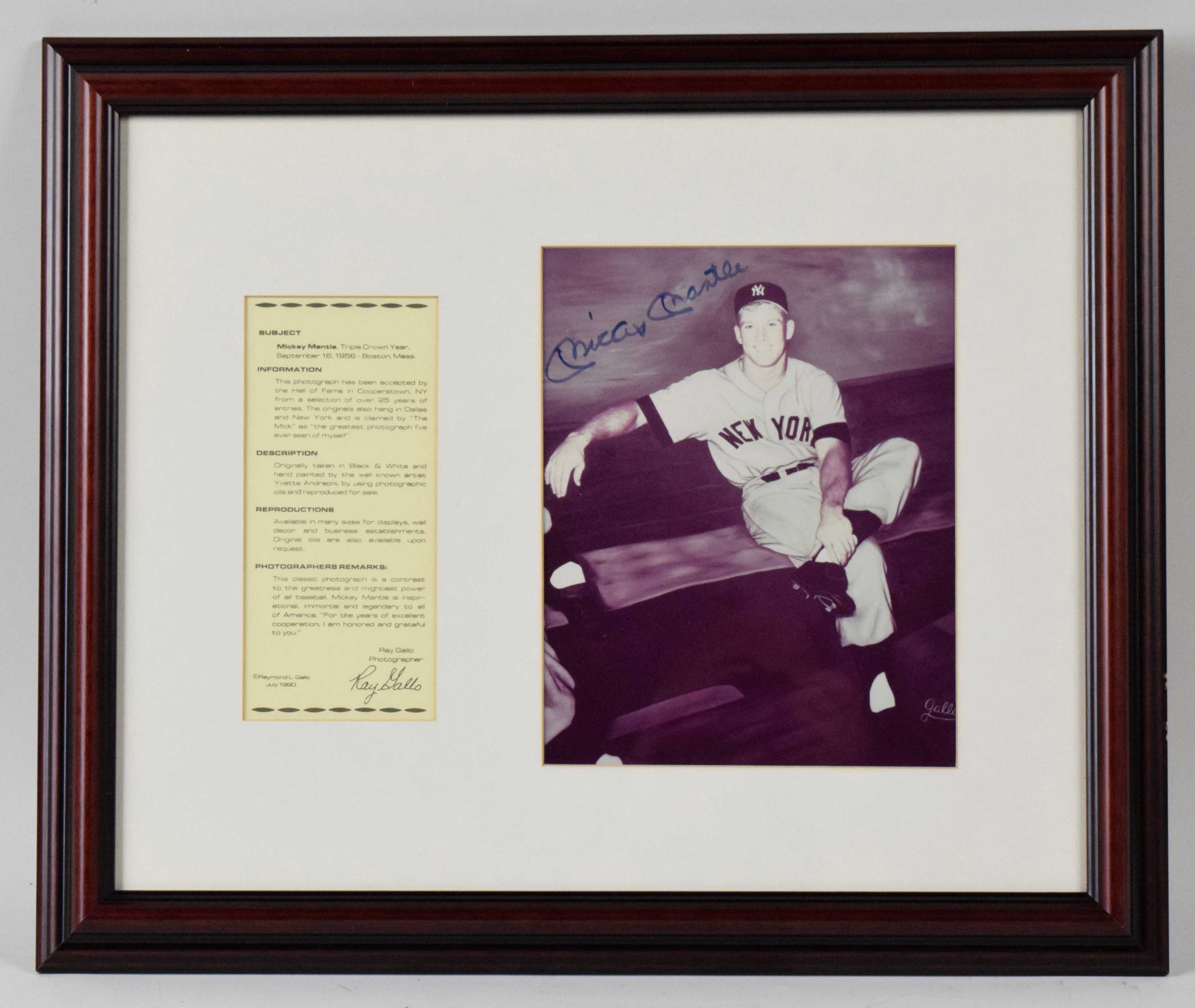 Description:Mickey Mantle framed and autographed Triple Crown year photo (Sig. NM/MT). Outstanding photo print by Ray Gallo depicting Mantle in the dugout during his 1956 Triple Crown Year has been signed by Mantle in blue marker, with signature rating 8 out of 10. Piece, with a write-up on the history of the photo to the left, has been framed to 21"x17". Frame has a few nicks: EX/MT.