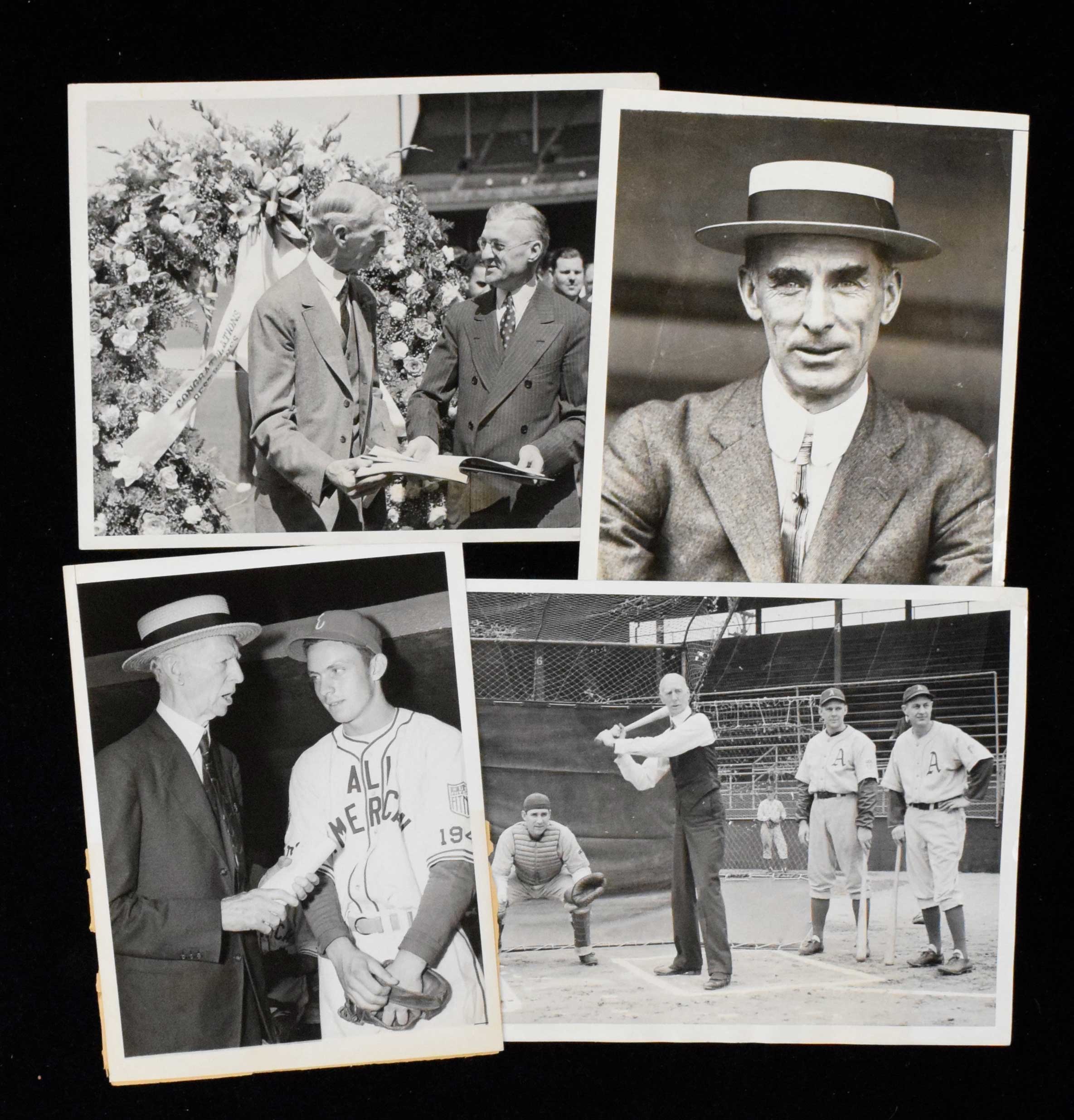 Description:Lot of (6) original Connie Mack wire photographs, plus (6) Philadelphia Athletics, c 1910-1940 (FR-VG/EX). Fantastic lot of original press photographs, with half depicting the Hall of Fame Athletics manager. Includes (1) c. 1910s 8 1/2"x6 1/2" portrait photo of Mack with International News Service stamping and caption on reverse (FR; chip on bottom edge); (1) 1933 8"x6" photo of Mack standing with Acme Newspictures stamping and caption (detached) on the reverse (VG); (1) 1938 9"x7" photo of Mack with A.L. President William Harridge with Acme stamping and caption on the reverse (VG); (1) 1943 9"x7" photo of Mack with the Philadelphia Athletics with Acme stamping and caption on the reverse (VG); (1) 1944 6"x8" photo of Mack with Joe Fromuth with Acme stamping and caption on the reverse (VG/EX); (1) 1941 8 1/2"x6 1/2" photo of Mack with Jimmy Dykes with International News Photo stamping on the reverse and caption on the front (affixed to the back); and (1) 1943 9"x7" photo of Mack with Lou Brissie with International News Service Photo stamping and caption on the reverse (FR). Lot also includes several other Philadelphia Athletics-related original wire photos including (4) 1925-1940 Earle Mack; (1) c. 1910 Danny Murphy; and (1) 1928 Mrs. Joe Hauser. Range all photos: FR-VG/EX.