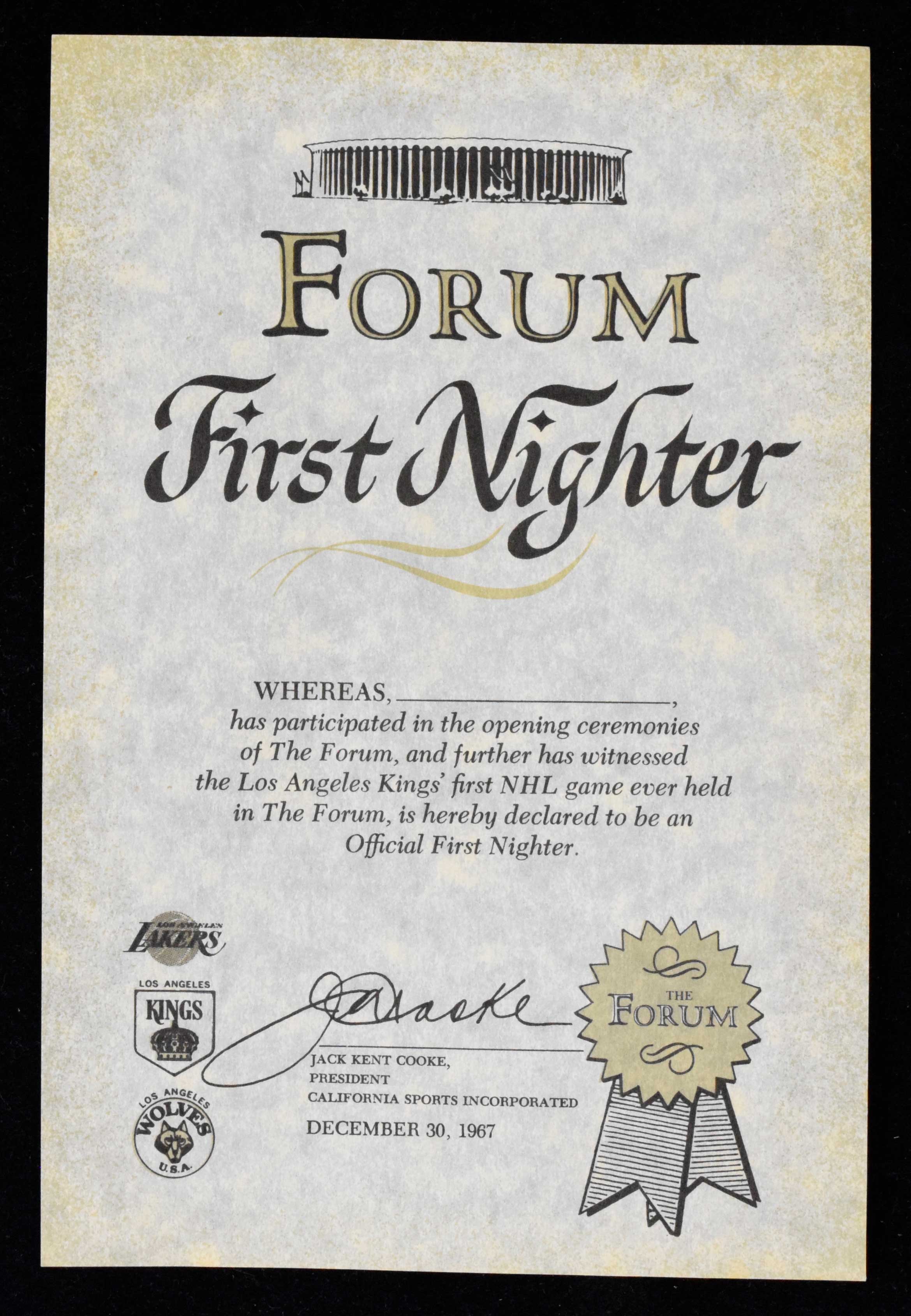 Description:1967 Los Angeles Kings certificate of attendance for first ever game at the Forum (NM). High-grade 9"x6" certificate from Dec. 30, 1967 was issued to those who "witnessed the Los Angeles Kings' first NHL game ever held in The Forum," with facsimile signature from owner Jack Kent Cooke. Unsigned certificate appears NM.