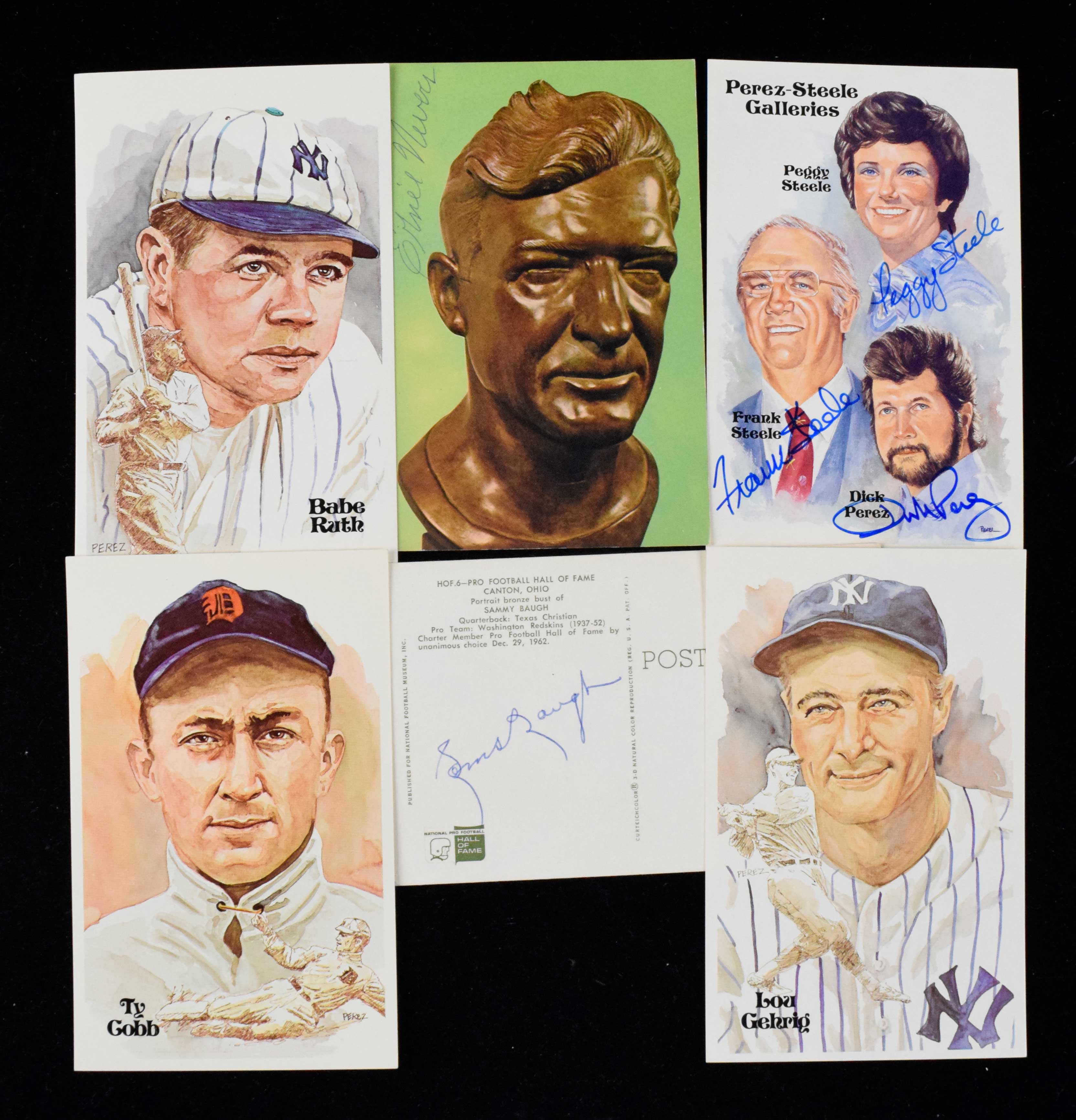 Description:Lot of (5) 1963 NFL HOF postcards, and (98) Perez-Steele postcards, with autographs (GD-NM). Nice lot of football and baseball postcards, with (5) 1963 Pro Football Hall of Fame bust postcards: (2) Sammy Baugh, with one autographed in ink on the reverse; John Blood McNally, Fats Henry, and Ernie Nevers (autographed in ink on the front). Also included are (97) unsigned 1980-81 Perez-Steele first through sixth series Hall of Fame postcards (with duplication), including Cobb, Ruth, Mathewson, Gehrig and more and (1) "Partners of Perez-Steele Galleries" postcard signed in blue ink by Peggy Steele, Frank Steele and Dick Perez. Signatures rate 7/8 out of 10, and postcards range GD-NM (most EX/MT or better).