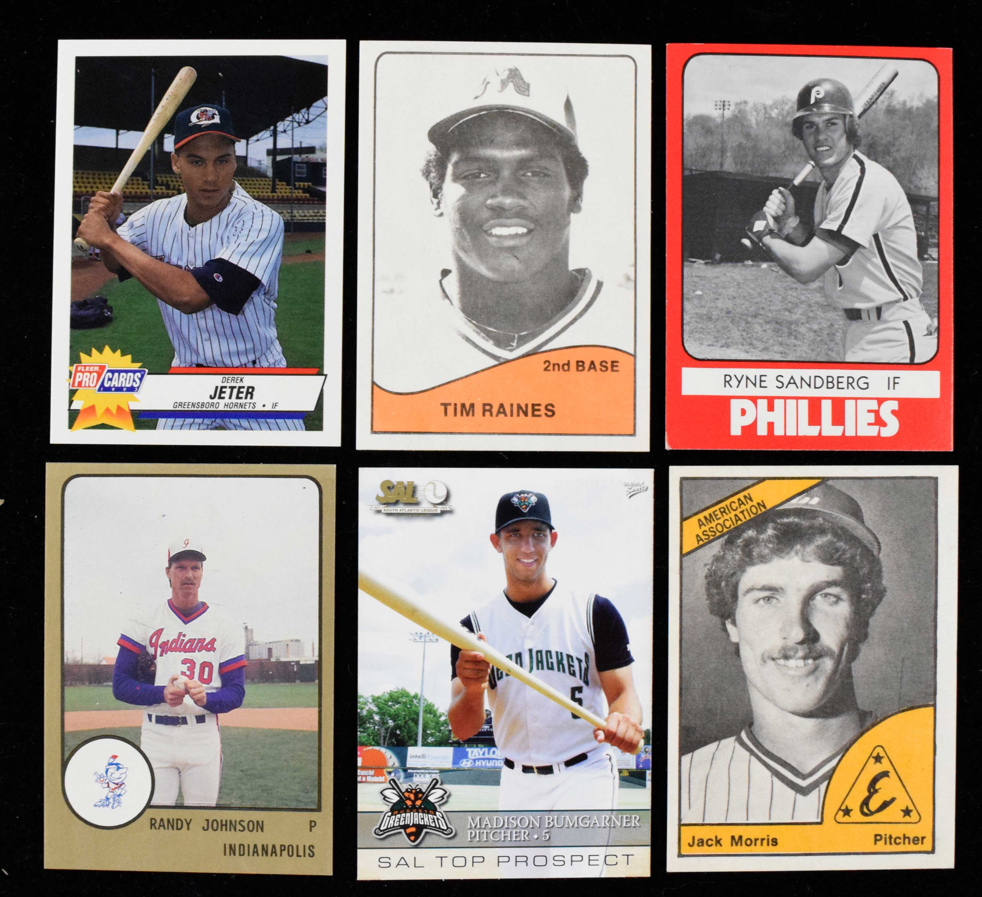 Description:Binder of (500+) 1977-2008 minor league cards, with Raines, Sandberg, Jeter & Bumgarner (VG/EX-MT). Outstanding quantity of cards in a binder, spanning 1977-2008 with ProCards, TCMA and other manufacturers capturing many Major League stars and Hall of Famers before they hit the big leagues. Many have outstanding grading potential. Highlights include 1979 TCMA Memphis Chicks #20 Tim Raines (NM/MT), 1977 Evans Triplets Jack Morris (EX/MT), 1980 TCMA Reading Phillies #22 Ryne Sandberg (VG/EX), 1980 TCMA Wisconsin Rapids Twins #27 Tony Oliva batting coach (EX/MT); 1978 TCMA Knoxville Knox Sox Harold Baines (NM), 1983 Fleer ProCards Greensboro Hornets #893 Derek Jeter (MT), 1988 ProCards Indianapolis Indians #510 Randy Johnson (NM/MT), 2008 Grandstand Jacksonville Suns Clayton Kershaw (MT); 2008 Multi-Ad South Atlantic League Top Prospects #5 Madison Bumgarner (MT) and many more. Most cards appear NM-NM/MT or better. Range: VG/EX-MT.
